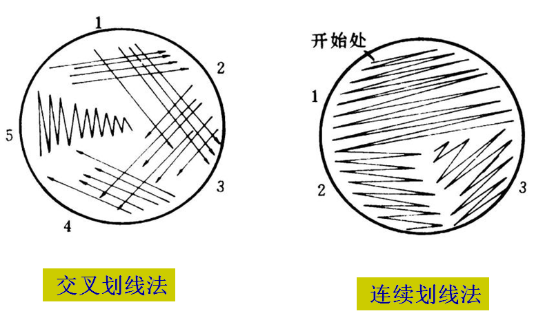 使用接种环,从待纯化的菌落或待分离的斜面菌种(本实验为10-2)中沾取少量菌样.在相应培养基平板中划线分离,划线的方法多样,目的是获得单个菌落,主要方法参见下图。