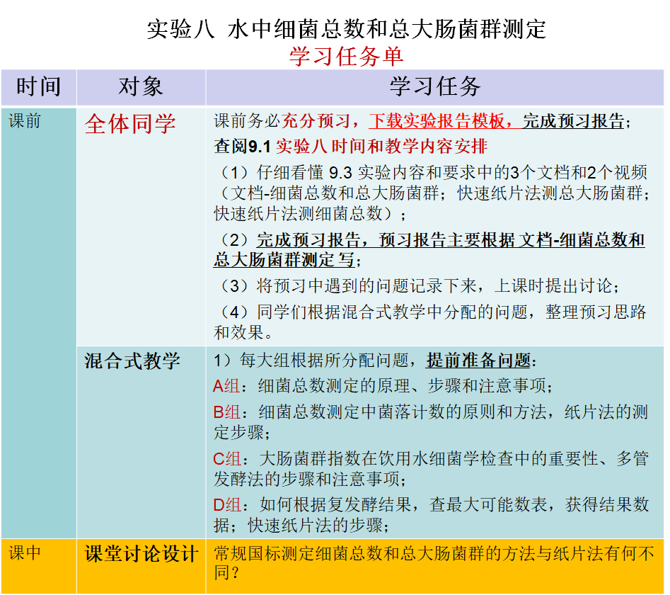 3. 温馨提示:本课程平台中同步展示了细菌菌落总数的测定和总大肠菌群的测定实验,由于学时调整,本次实验课堂只开展水体中细菌菌落总数的测定,不进行大肠菌群的测定。请大家结合实验报告模版的内容进行相应的选择性预习和学习。