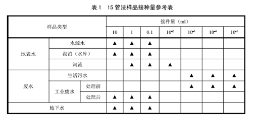 2)池水、河水或湖水①稀释水样:将水样稀释成10-1与10-2。②初发酵:分别吸取1mL10-2、10-1的稀释水样和1mL原水样,注入装有10mL普通浓度乳糖蛋白胨试管中。另取10mL和100mL原水样,分别注入装有5mL和50mL三倍浓缩乳糖蛋白胨水培养基的试管和三角烧瓶中。③以下步骤同上述“自来水”的平板分离和复发酵试验。所加水样体积为100、10、1、0.1mL的发酵管结果查附表11-3;水样体积为10、1、0.1、0.01mL的发酵管结果查附表11-4(15管法,最大可能数表),即得每升水样中的大肠菌群数。