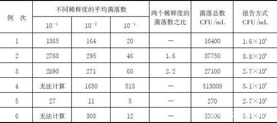 5)若所有稀释度的平均菌落数均不在30~300个之间,则以最接近300或30的平均菌落数乘以稀释倍数计算(附表2中例6)。