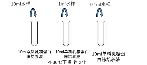 1)自来水①初发酵:取10mL水样接种到10mL双料乳糖蛋白胨培养液中,取1mL水样接种到10mL单料乳糖蛋白胨培养液中,另取1mL水样注入到9mL灭菌生理盐水中,混匀后吸取1mL(即0.1mL水样)注入到10mL单料乳糖蛋白胨培养液中,每一稀释度接种5管。混匀后,于36℃培养24h(24h未产气的继续培养至48h)。