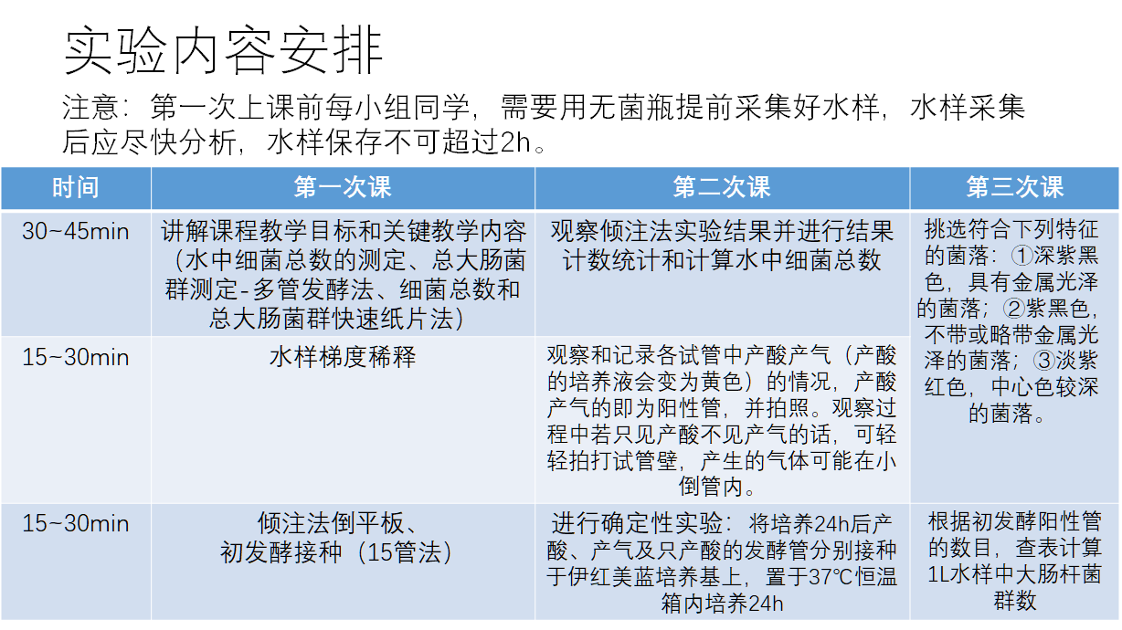 (1)学习水中细菌总数和大肠菌群数量测定的方法-多管发酵法。