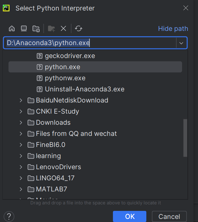 提示:如果安装有anaconda3,则选择anaconda3下面的解释器。没有安装,则随机选择一个python3.7以上的python解释器即可。记住这个路径。