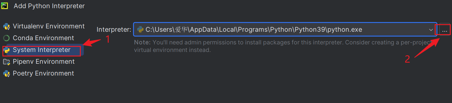 3,add python Interpreter窗口,选择system interpreter,单击右侧省略号