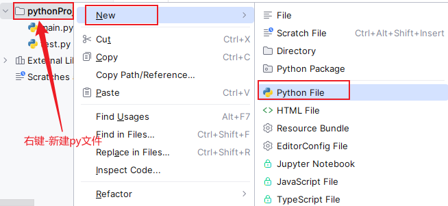 (1)单击工程文件夹,右键,选择:新建—Python File—test.py文件