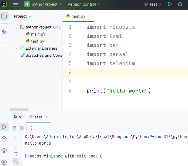 (3)在代码区单击右键(或者单击运行按钮)—Run 'test' 运行当前文件。