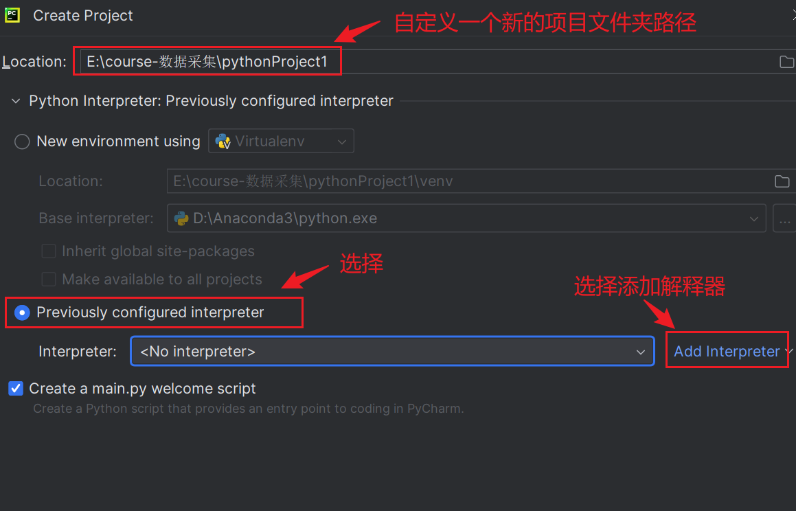 选择:使用已配置好的解释器,选择:add interpreter,添加解释器。
