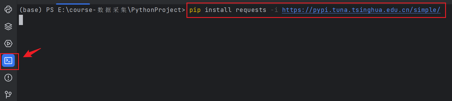 以安装requests库为例(其他库类似安装),打开pycharm,在terminal终端运行(或者在cmd终端/anaconda prompt终端运行):