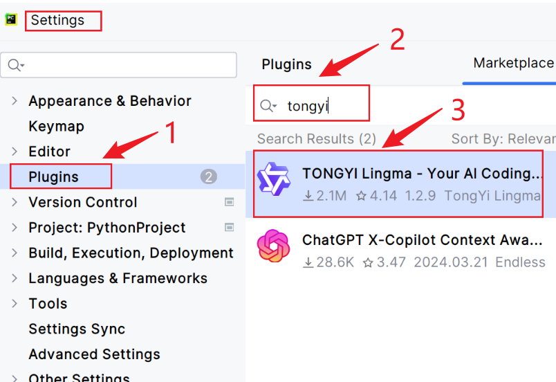 ② 选择插件“Plugins”,搜索tongyi,在搜索结果中选择TONGYI Lingma,单击install安装