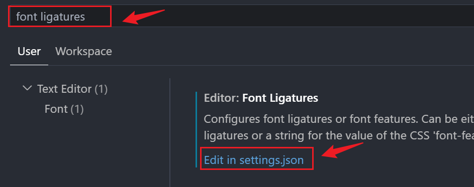 (2)搜索:font ligatures ,打开:Edit in setting.json文件