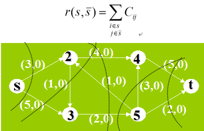 定义:把网络的点集分割为两个非空集合S和S,且S包含 Vs 点,另一个包含 Vt 点 ,则把始点在S中,终点在S中的弧的集合称为分离Vs和Vt的一个截集。