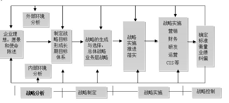 战略管理是一个科学的逻辑过程,是对一个企业未来发展方向制定和实施决策的动态管理过程。一个规范性的、全面的战略管理过程可大体分为四个阶段,即战略分析阶段、战略制定阶段、战略实施阶段以及战略控制阶段。