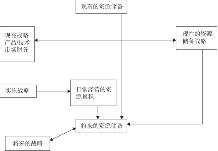 伴随着战略的展开,资源被不断储备,新的资源与现有资源的储备交织在一起,形成了将来的资源储备。企业以这些新的储备为基石,将来再进一步展开战略。因此,处于现在战略和将来战略中间的新的资源储备,也就成为连接这两个战略的媒介。当现有战略为将来的战略展开有效的资源积累时,将来的战略也能够有效地利用这些积累的资源,这就形成了企业中的战略与资源的动态组合过程。为了实现这个动态过程,企业首先必须考虑两个问题:一是现在的战略应该选择为什么样的战略;二是将来应当选择什么样的战略。然后,企业才能在二者之间调配适当的资源,而资源在这个过程中将起到动态相辅和动态相乘的两个效果。