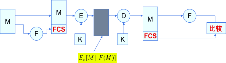 1.对称加密体制下的加密认证:使用消息加密之后得到的密文作为认证的度量。攻击者不知道秘钥K,也就无法篡改消息。
