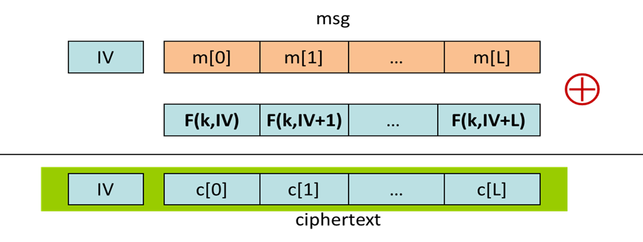3.随机计数器模式(CTR)的基本思想:采用流密码的设计思想,利用伪随机函数F来产生伪随机秘钥流,并与明文进行异或计算明文。每加密一个消息M,首先随机生成一个初始向量IV。作为一个计算器,每加密一个分组,IV都要加1.每个明文分组与F函数的相应输出进行异或,从而得到相应的密文。随机CTR模式可以并行计算,即多个分组可以同时进行加解密。