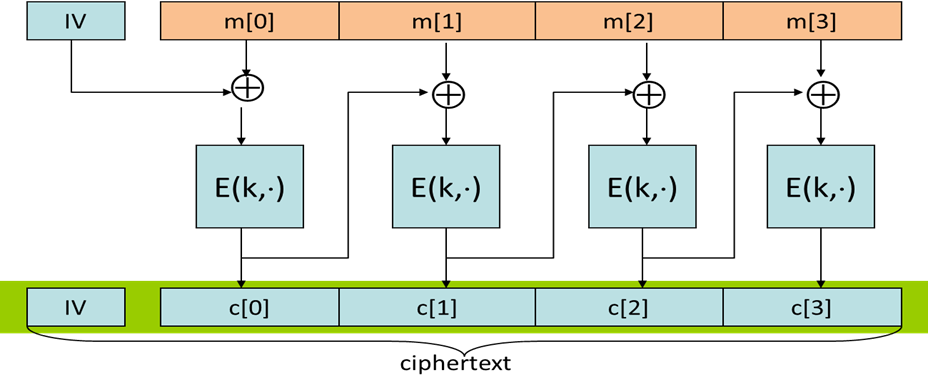 2.密文分组链接模式(CBC)的基本思想:每加密一个消息M,首先随机生成一个初始向量IV。第一个明文分组m[0]与IV异或后代人加密算法,之后的明文分组在被加密前,先和上一分组的密文进行异或运算。