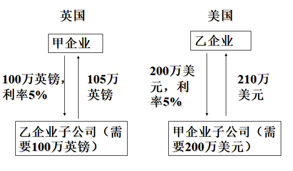 甲企业借给自己的子公司100万英镑,即200万美元,约定1个月以后连本带息还款105万英镑,即210万美元。