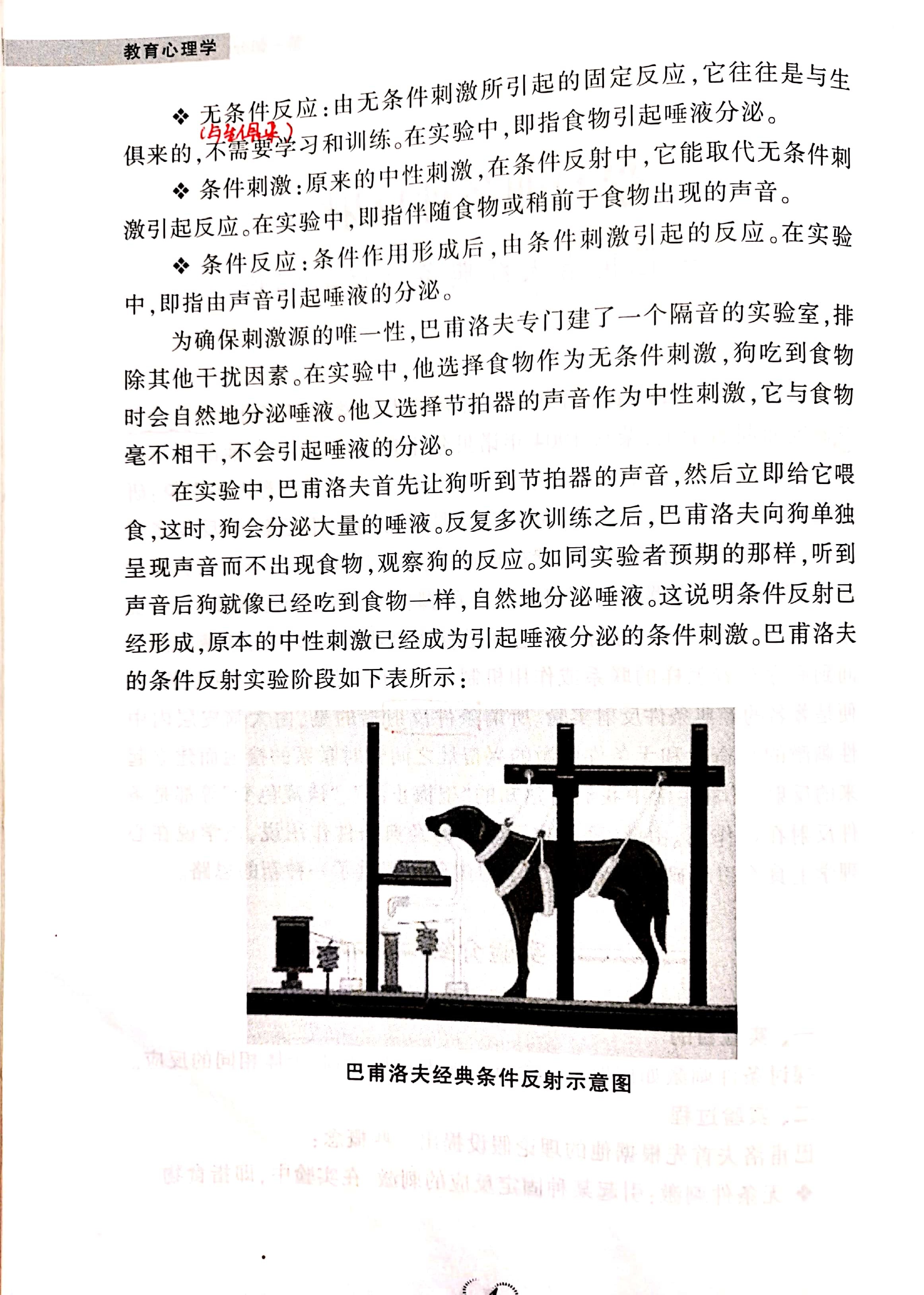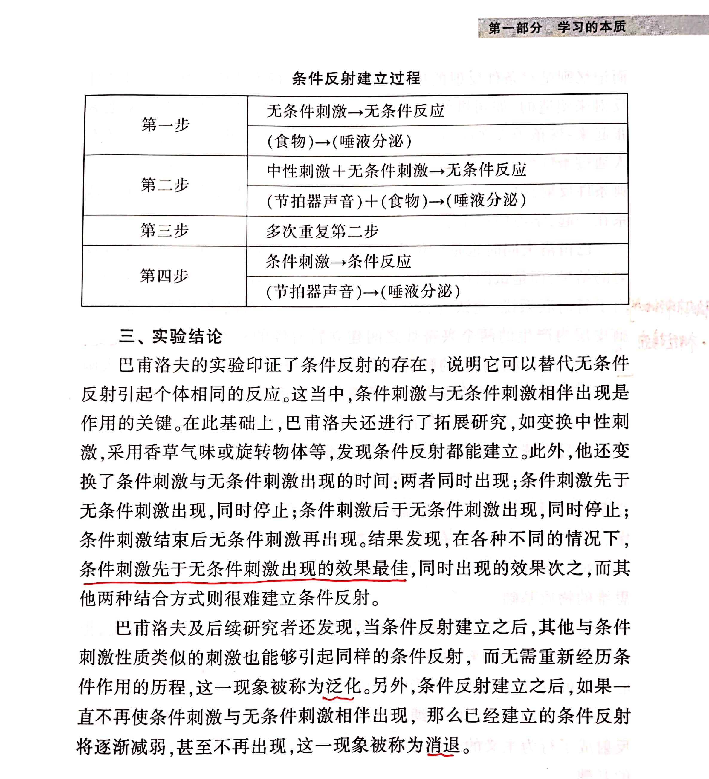 学习目标:理解经典性条件反射形成的过程,掌握经典性条件作用中学习的内涵,理解消退、泛化、分化、高级条件作用以及两个信号系统的内含,并能举例说明。