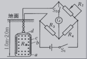 岩石在地壳运动的过程中,要受到各种能量所产生 的作用力的推动.地壳岩石在受力发生构造变形的过程中,必定产生一种与这种推动力相抗衡的内力.我们把地壳岩石中的单位面积上的这种内力,叫做地壳岩石的应力,简称地应力,它是量度地壳岩石内力的尺度.在地壳中的各个地点,地应力值的大小是不相同的,变化也是很不一致的.一般地说,地震的孕育和发生的过程,乃是地壳岩石中地应力的积累和释放的过程.在这个过程中,地应力必然地是从一个相对平衡的、变化不大的正常状态,转化到一个发生不均匀的、强烈变化的异常状态.因此,地应力值的异常变化,是地震的一种前兆现象.图1为“非平衡电桥地应力仪”的结构原理和线路.图中 R2、R3、R4 都是精确的碳膜电阻,Rx 是自制的受压可以改变电阻值的电阻元件,称为传感探头,也叫“压力传感器”,是一种“转换元件”.其受压,碳粉紧缩,电阻值变小,电流增大;压力减小,碳粉松弛,电阻值变大,电流减小.在探头内的碳粉中混入一定比例的橡皮粉,能使碳粉具有良好的弹性,提高传感探头的灵敏性.其结构如图1所示,其中 a 表示碳粉、橡皮粉混合物,b 表示薄铜片电极,c 表示密封胶皮外套(能很好解决湿度的影响),d 表示电极引出的导线。