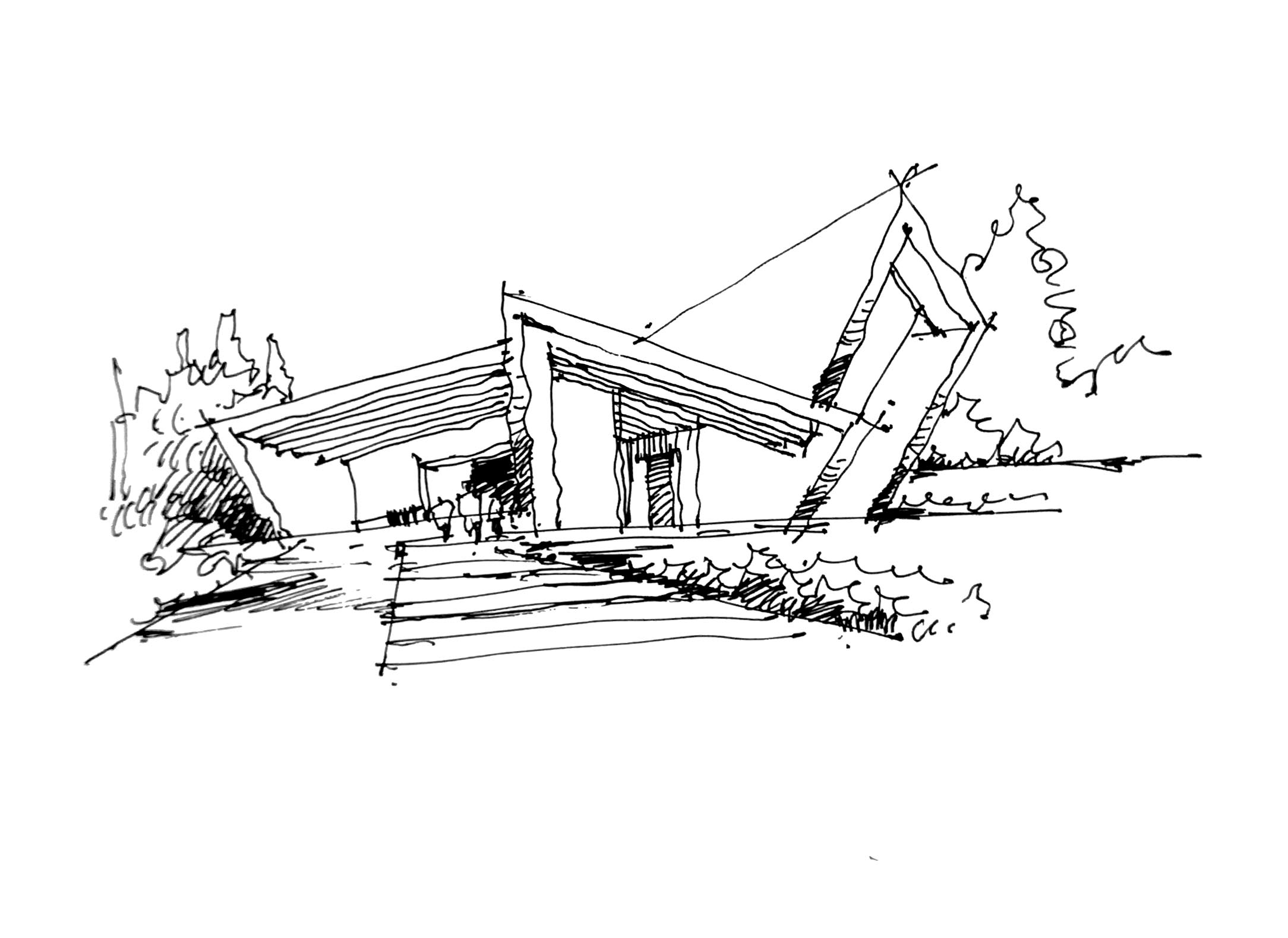 建筑草以记录建筑体块关系为主,但与前面所讲的用快题来练习线条不一的地方则建筑草图也注重基本细节的表达。一般情况下,优秀的建筑其体块及材质关系所呈现出来的黑白灰关系是满足形式美规律的,也是极富有节奏感的,因此我们在建筑草图练习时要善于去观察,把握好建筑体块之间的比例,用线条的疏密变化来表达其材质对比关系,包括实墙面与窗户之间的虚实关系。