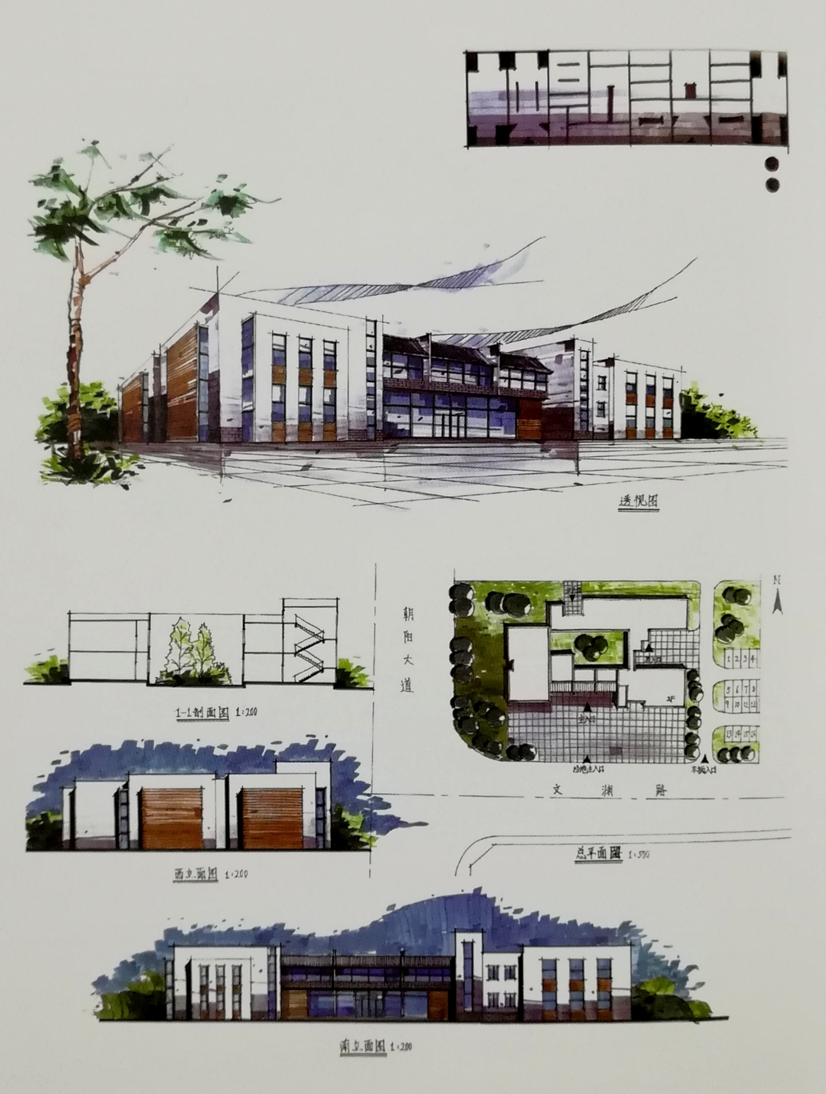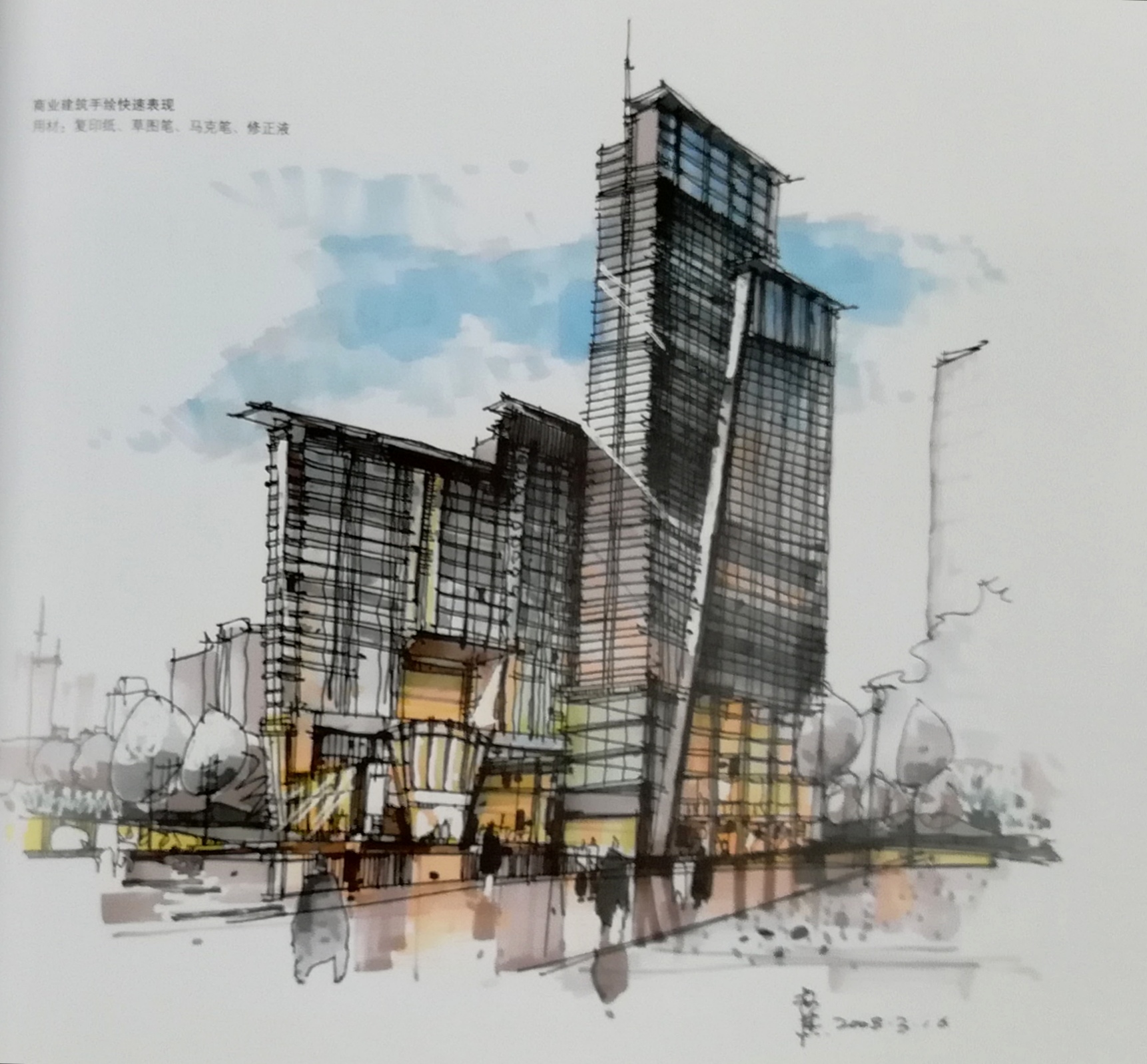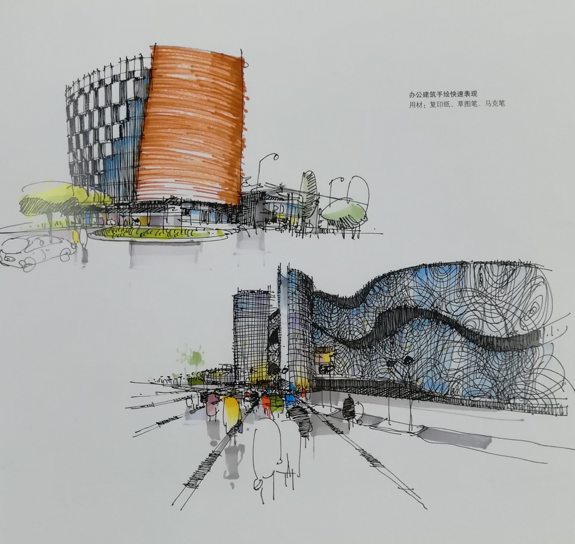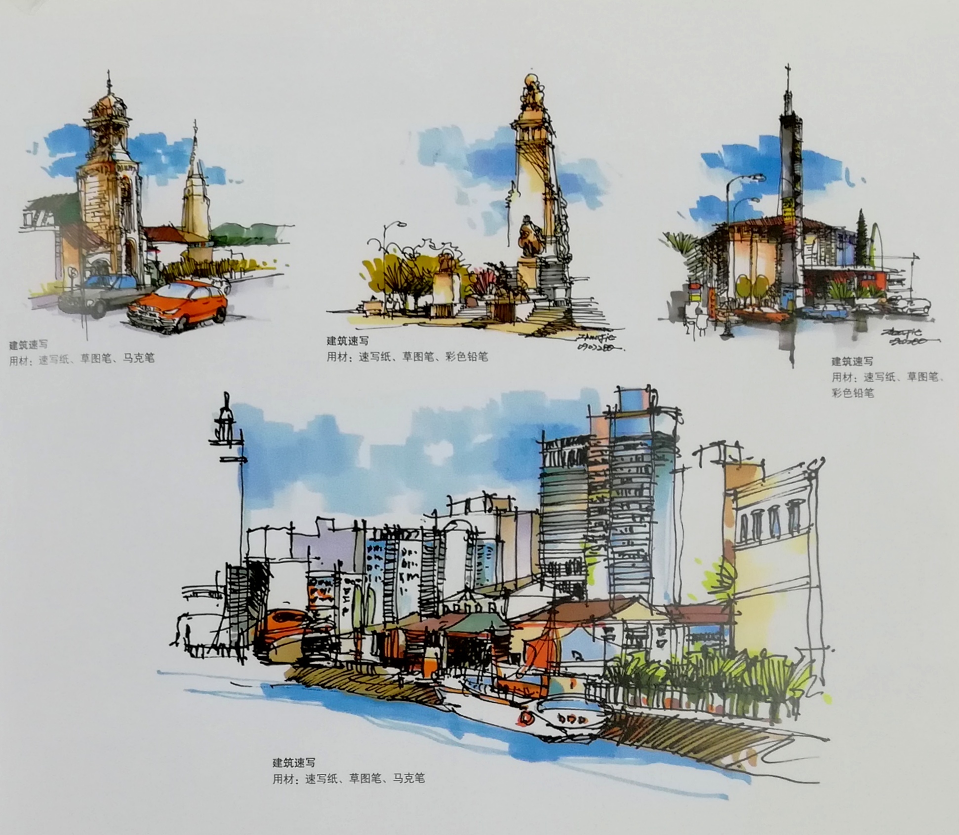 建筑表现技法课程的重点:建筑外观钢笔、马克笔表现技法的学习,草图,快题设计表现。