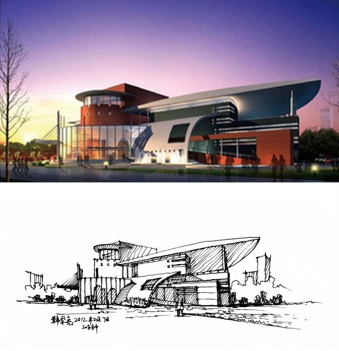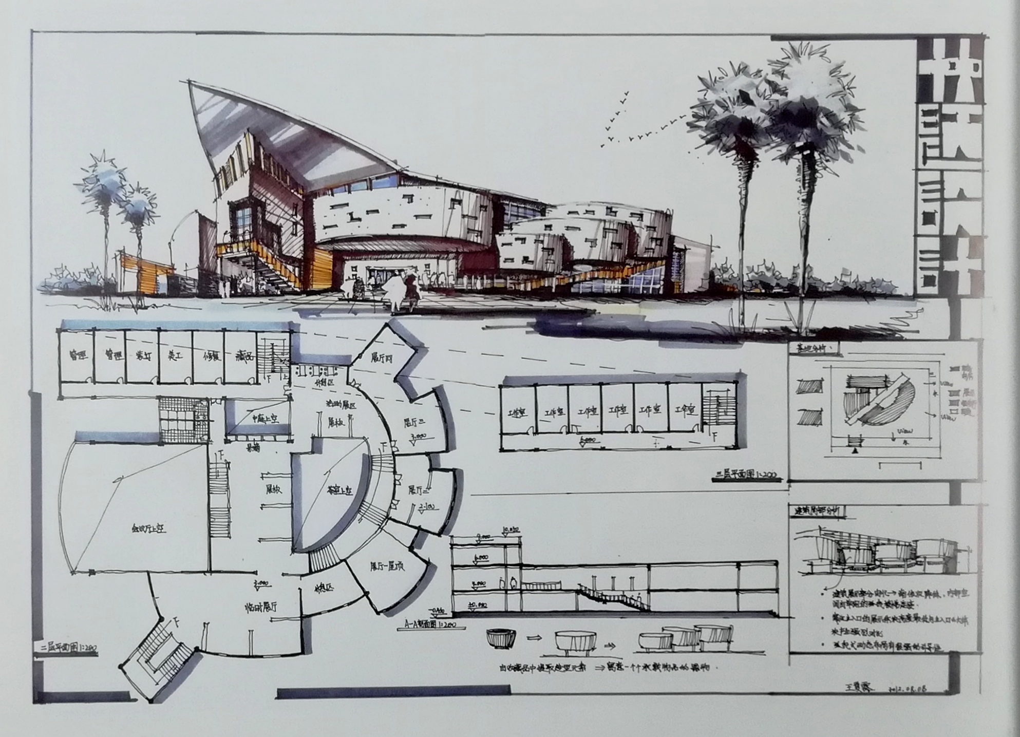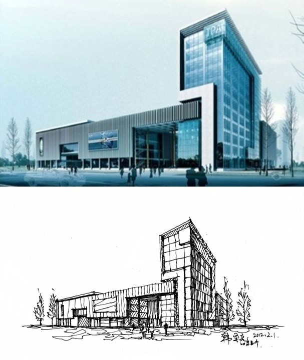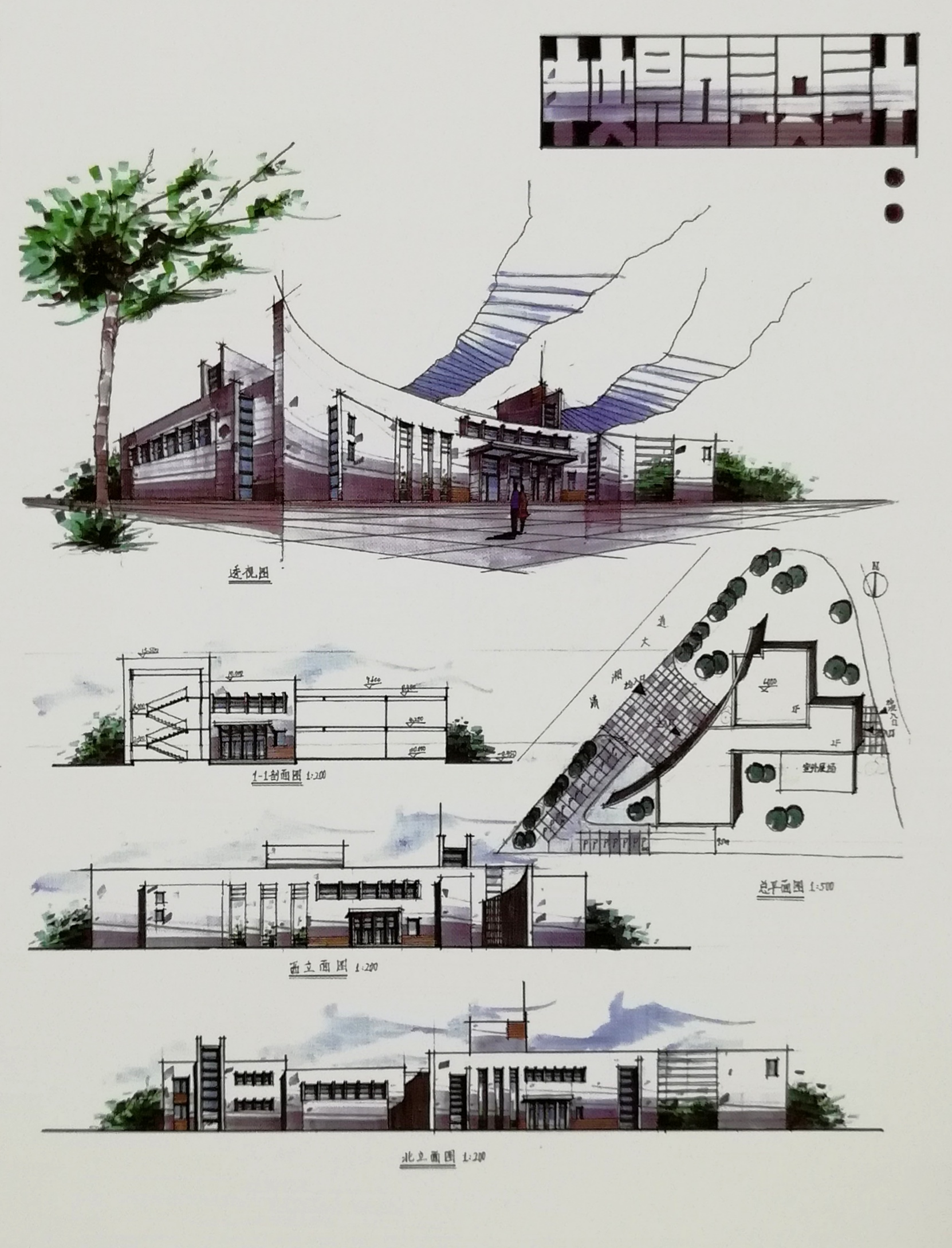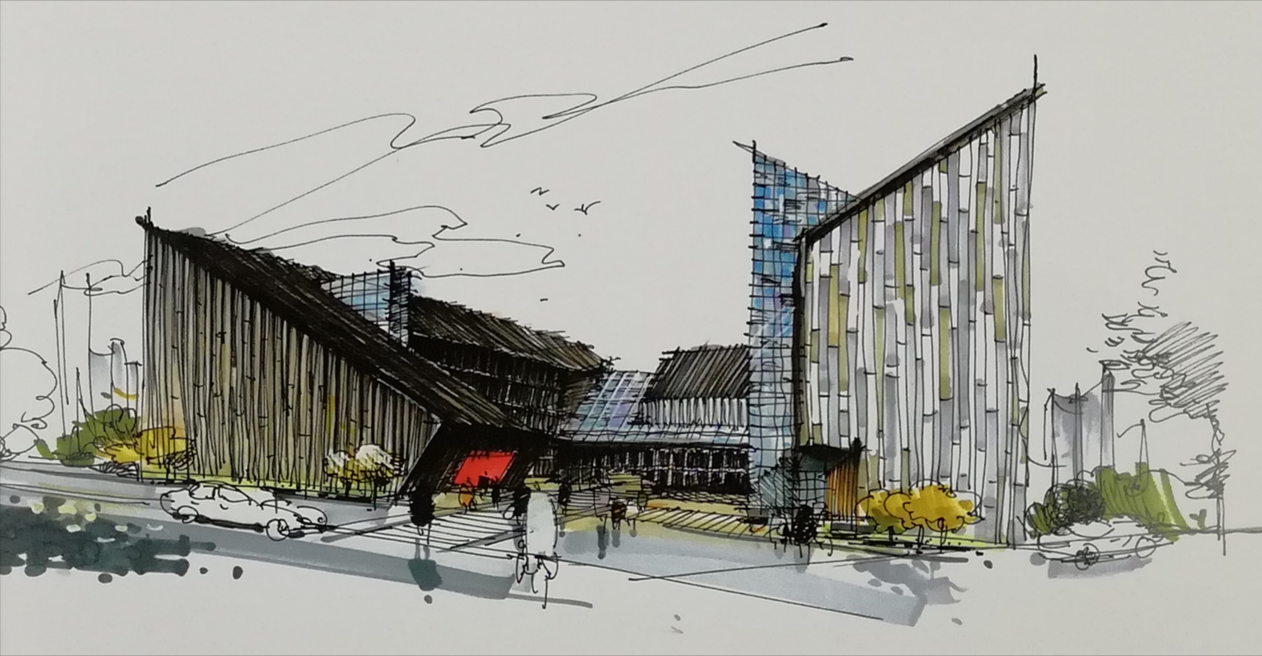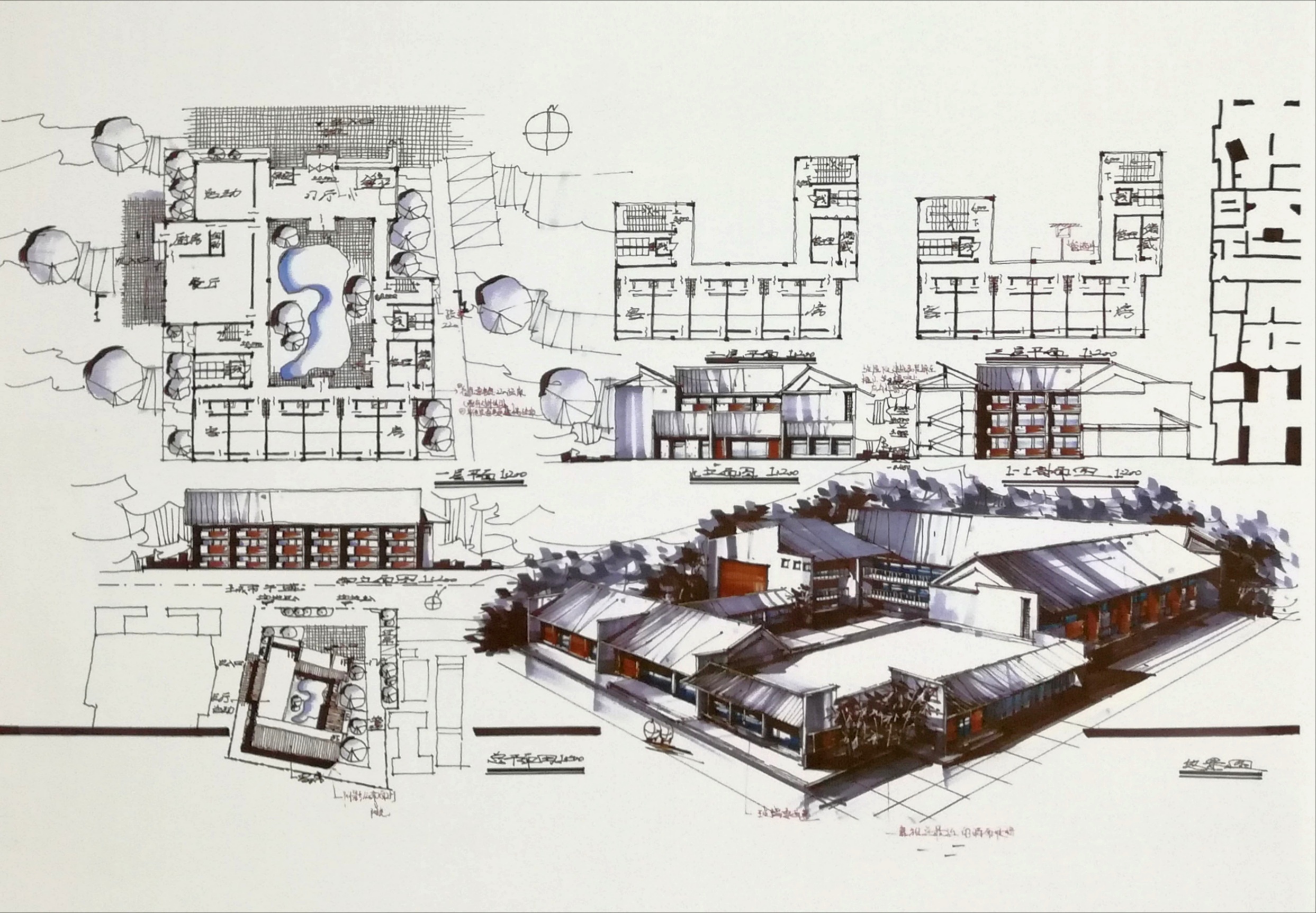 建筑表现技法课程的重点:建筑外观钢笔、马克笔表现技法的学习,草图,快题设计表现。