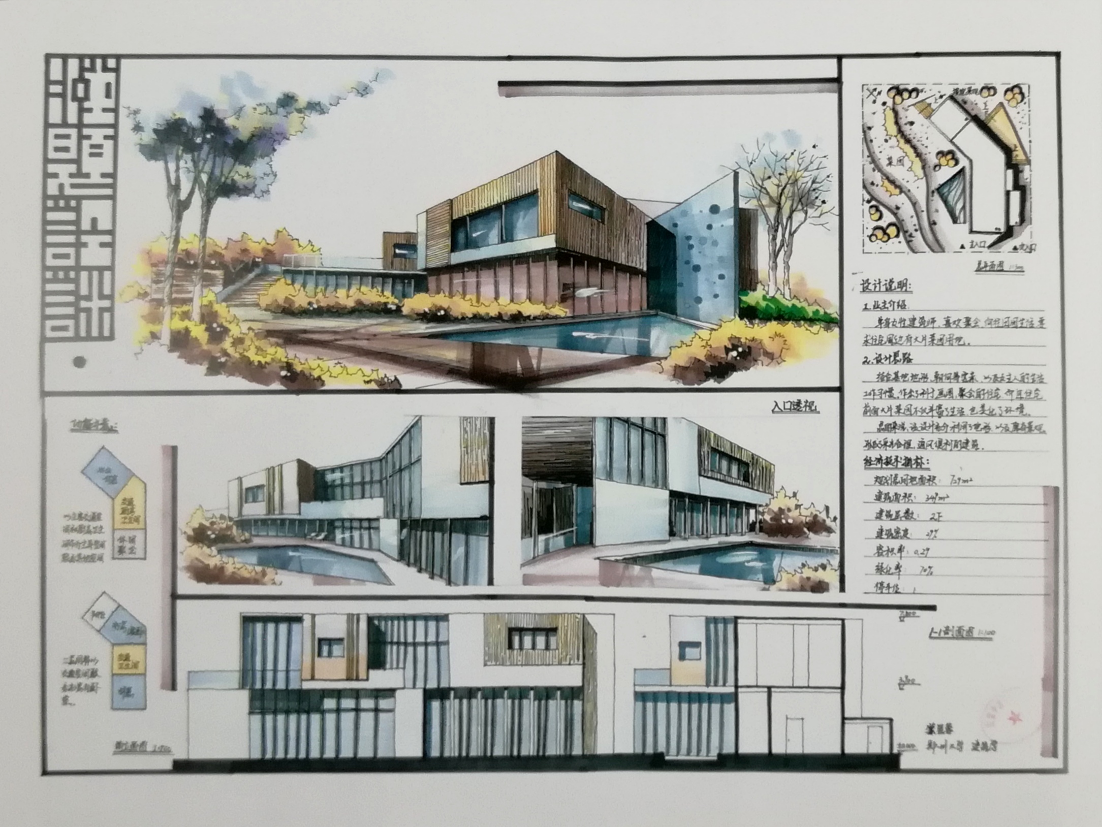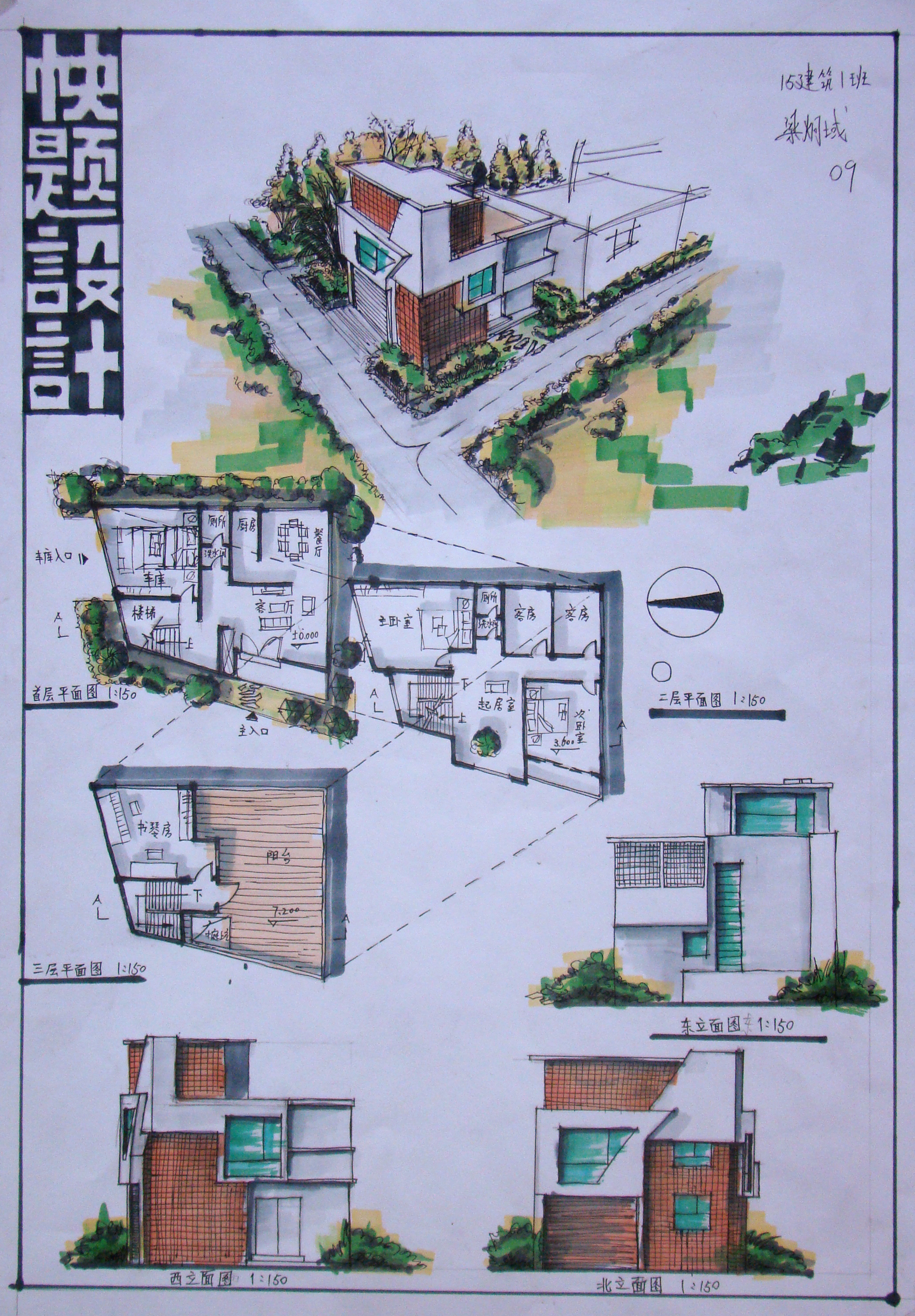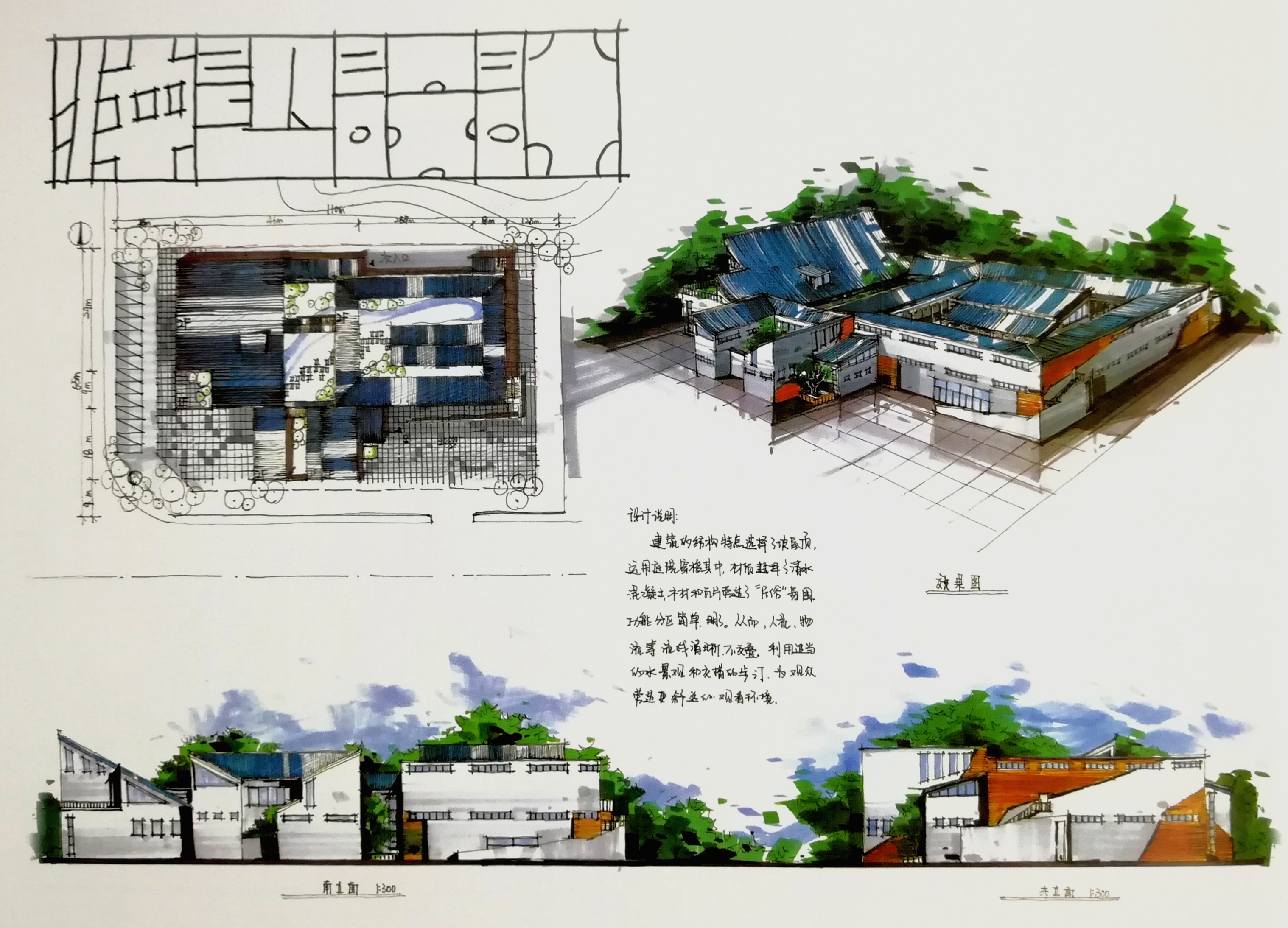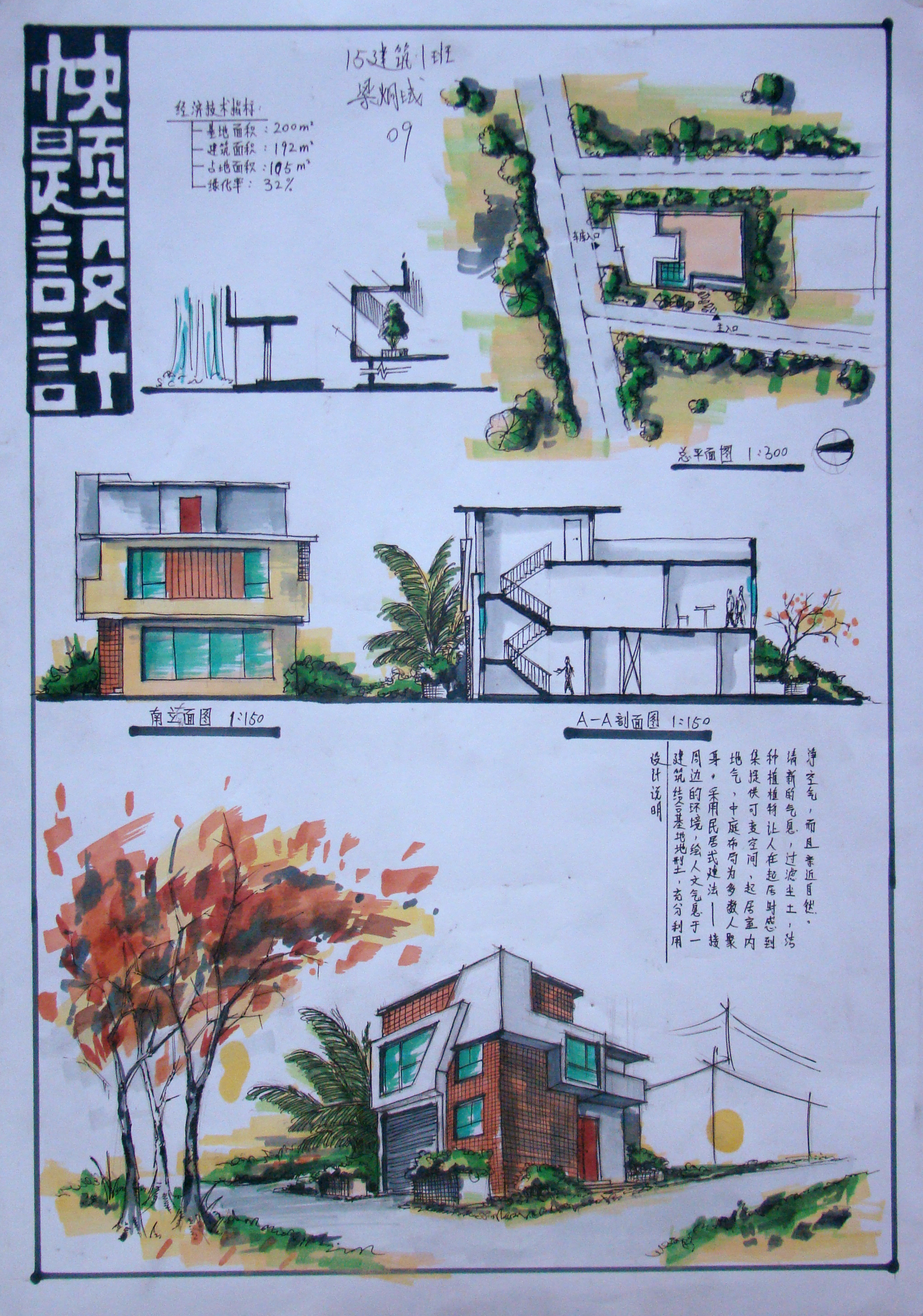 在6周内完成1份(2张)A3大小的定稿手绘快题设计作业。内容包括建筑外观手绘图、总平面图、鸟瞰图、立面图、节点大样图、分析图、设计说明。要求运用钢笔、、彩色铅笔、马克笔表现技法完成作业。作业画在A4大小的复印纸上,不用装裱。(如果画透视图觉得有难度,可以用计算机辅助设计,导出线图,再绘制手绘图,或手工上色。电子文档一并上交,存2010版本)。