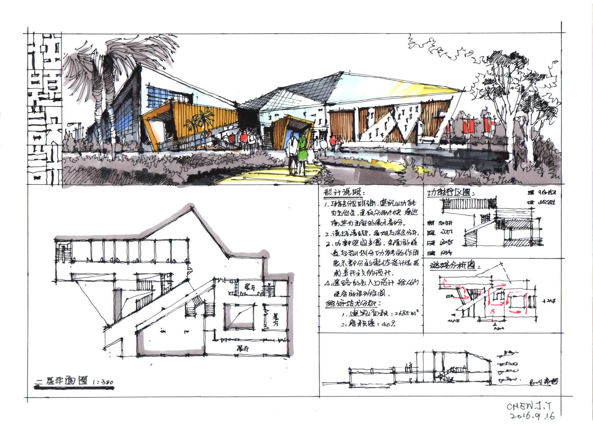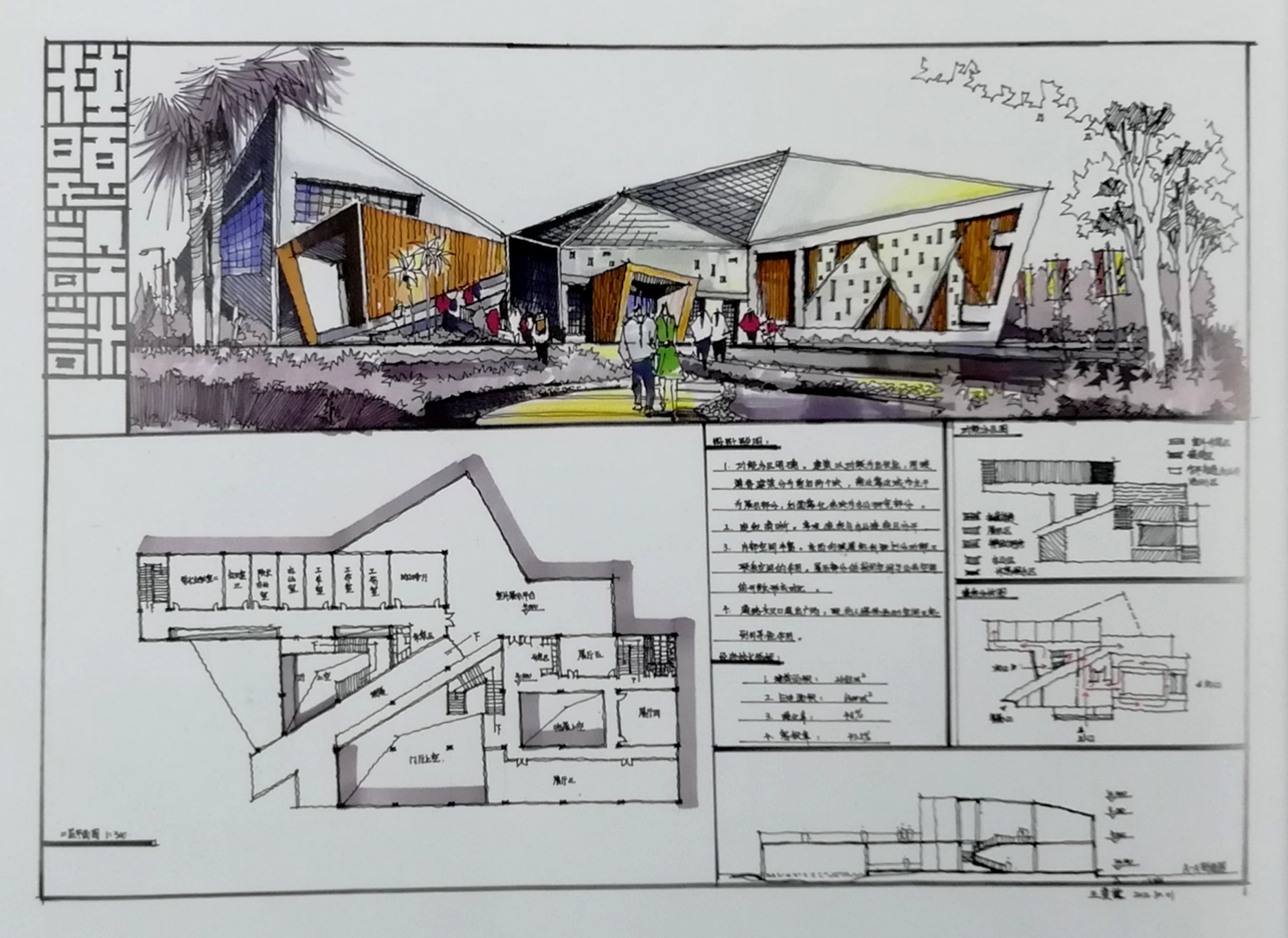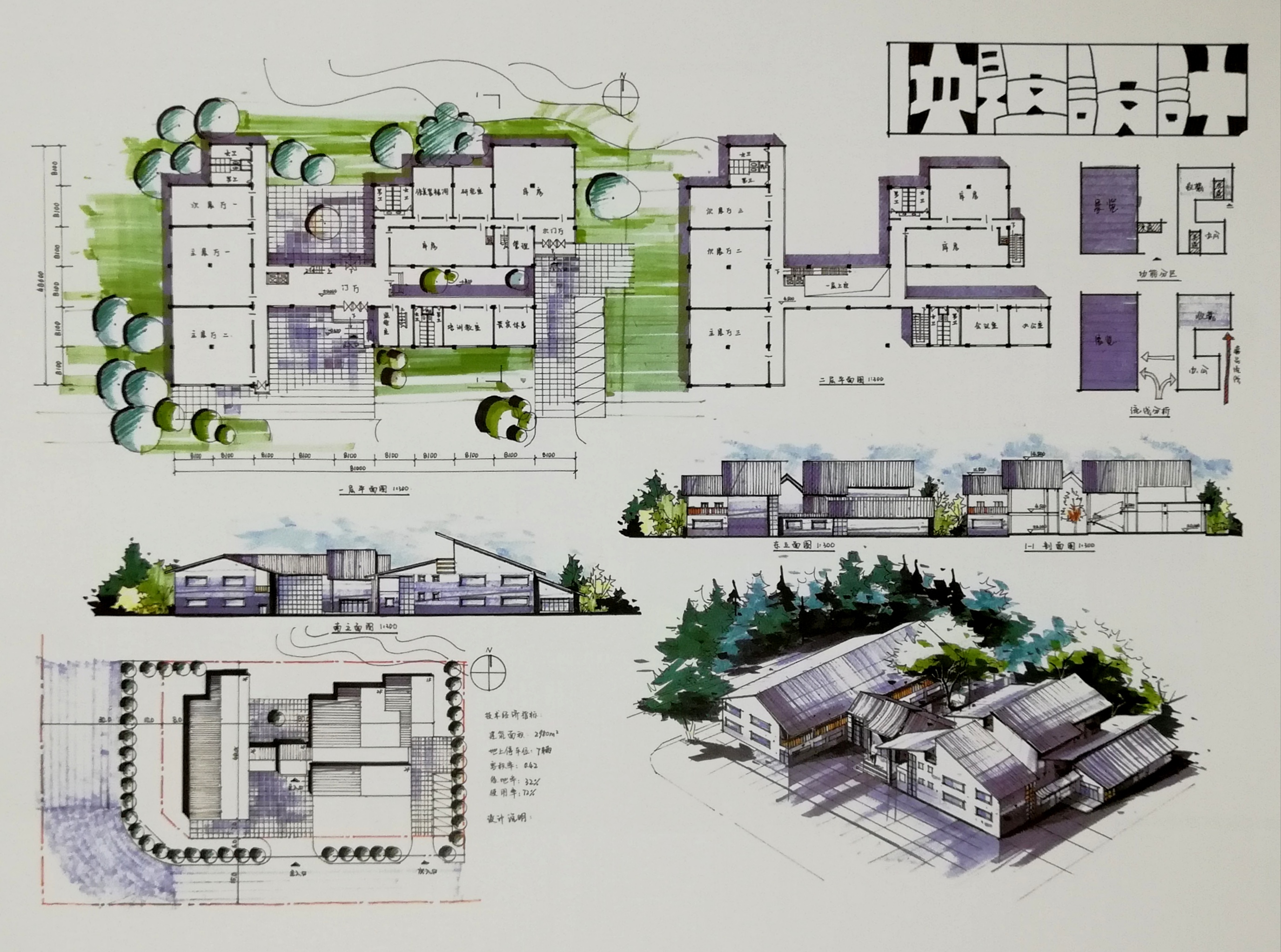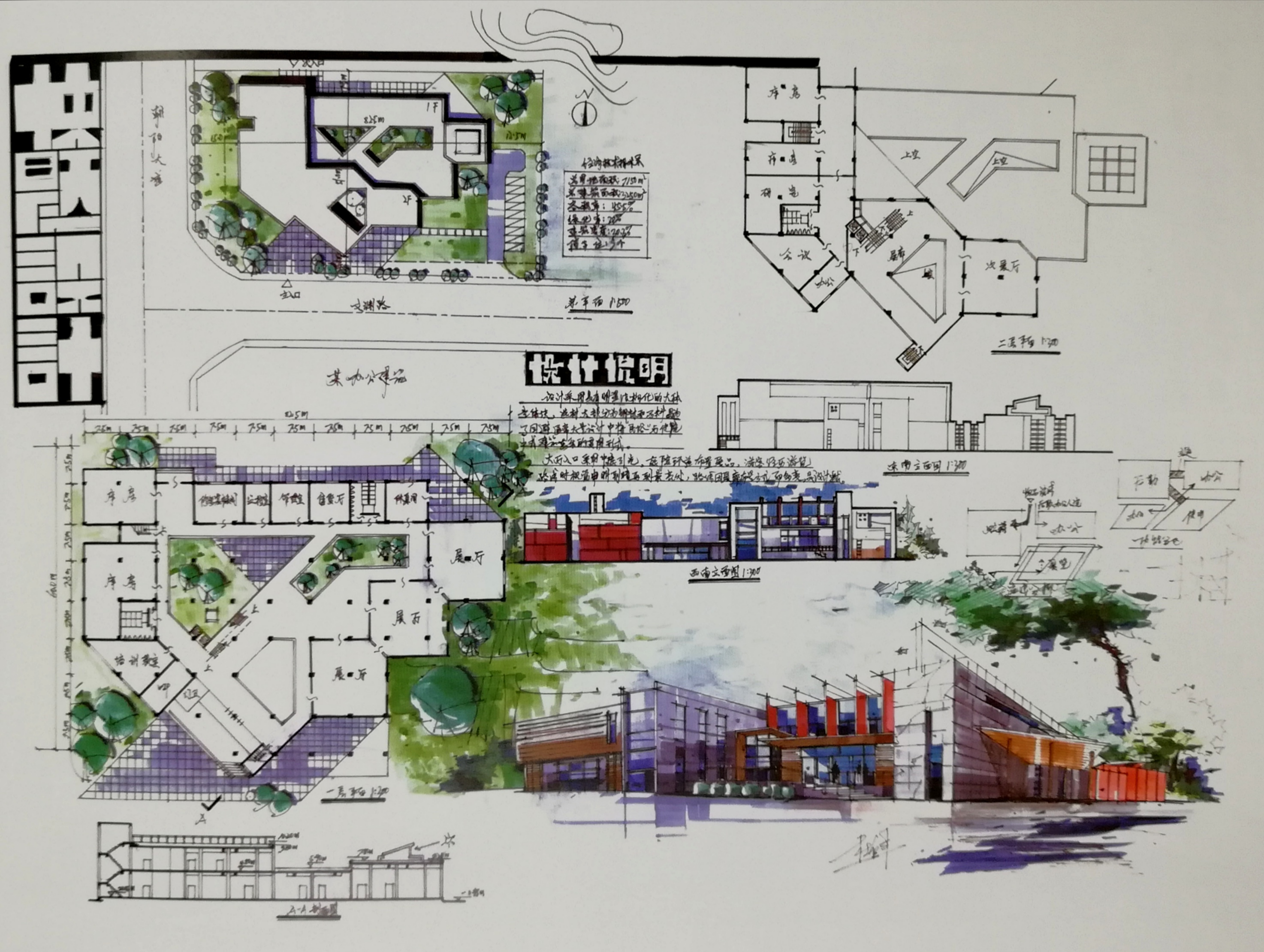 在6周内完成1份(2张)A3大小的定稿手绘快题设计作业。内容包括建筑外观手绘图、总平面图、鸟瞰图、立面图、节点大样图、分析图、设计说明。要求运用钢笔、、彩色铅笔、马克笔表现技法完成作业。作业画在A4大小的复印纸上,不用装裱。(如果画透视图觉得有难度,可以用计算机辅助设计,导出线图,再绘制手绘图,或手工上色。电子文档一并上交,存2010版本)。