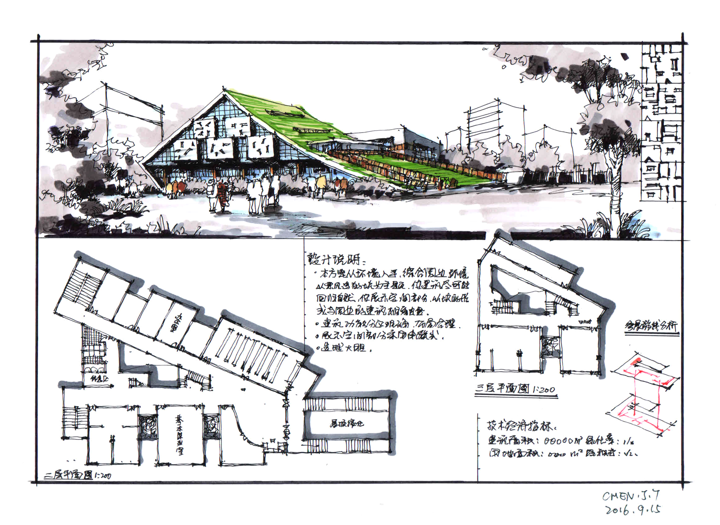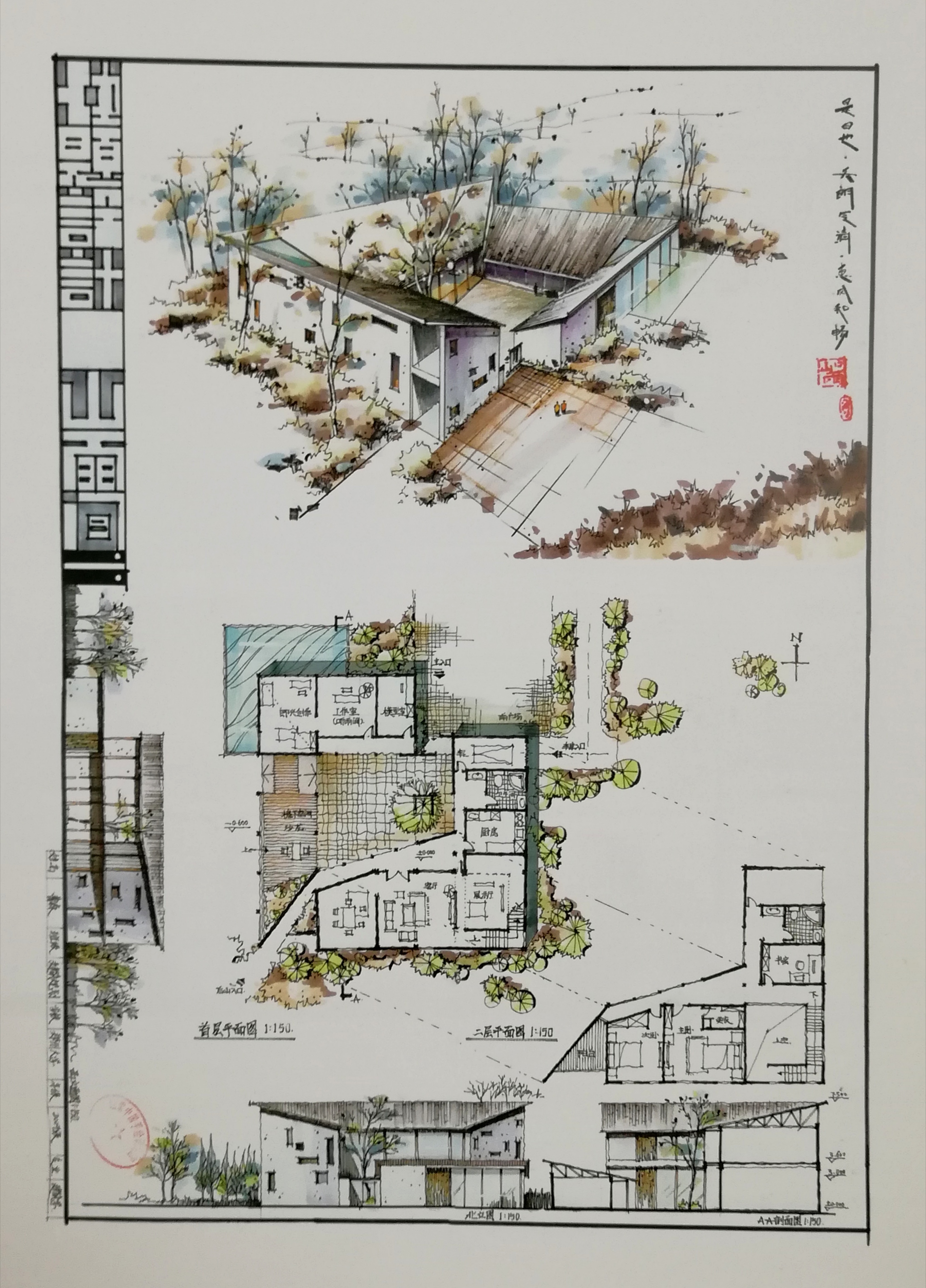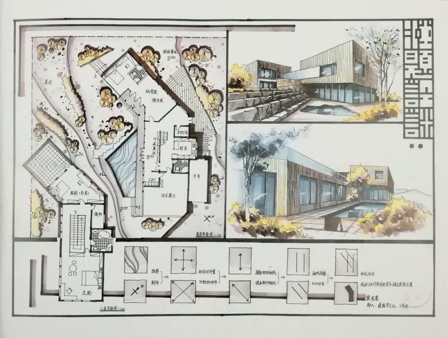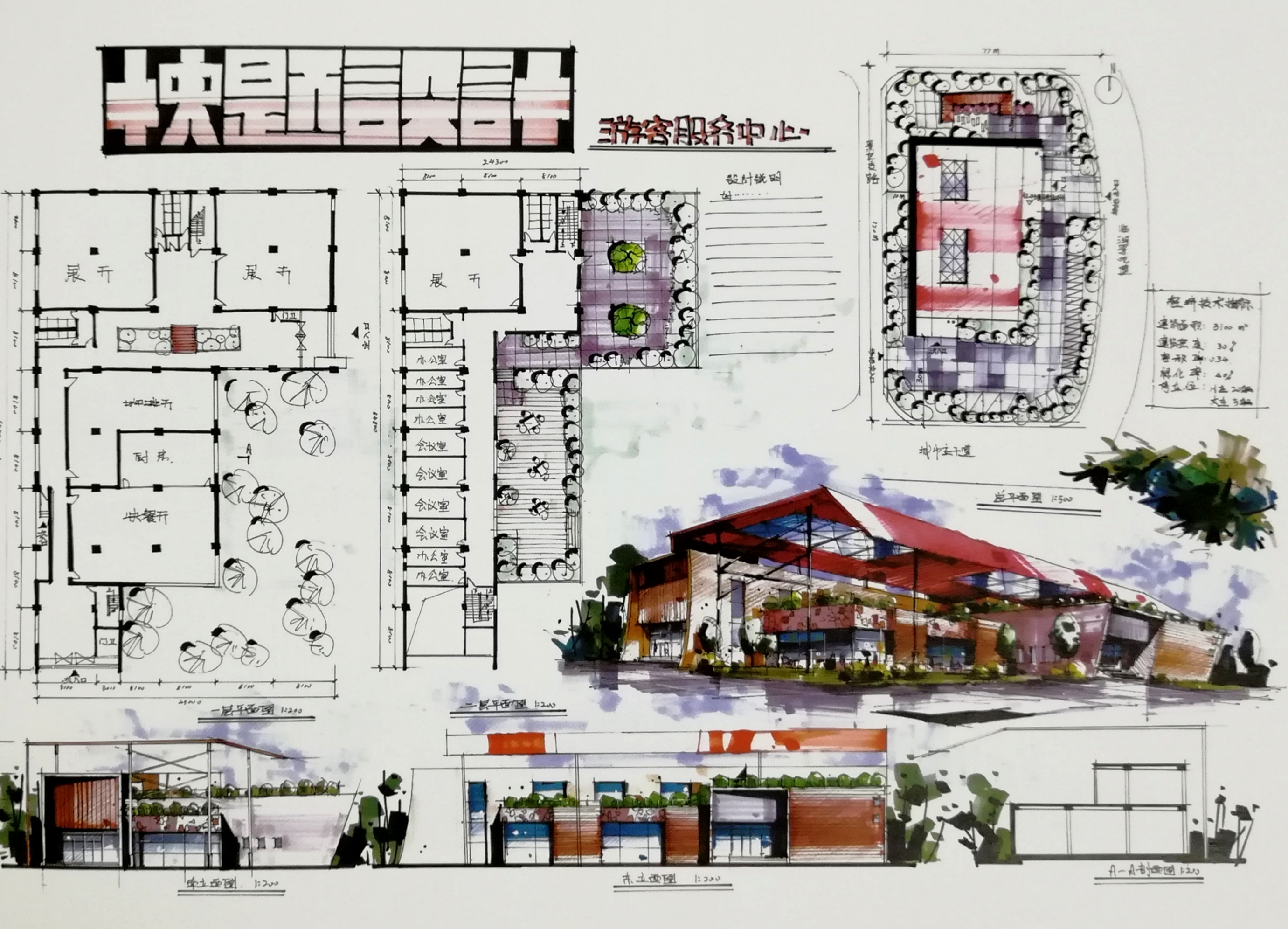 在6周内完成1份(2张)A3大小的定稿手绘快题设计作业。内容包括建筑外观手绘图、总平面图、鸟瞰图、立面图、节点大样图、分析图、设计说明。要求运用钢笔、、彩色铅笔、马克笔表现技法完成作业。作业画在A4大小的复印纸上,不用装裱。(如果画透视图觉得有难度,可以用计算机辅助设计,导出线图,再绘制手绘图,或手工上色。电子文档一并上交,存2010版本)。