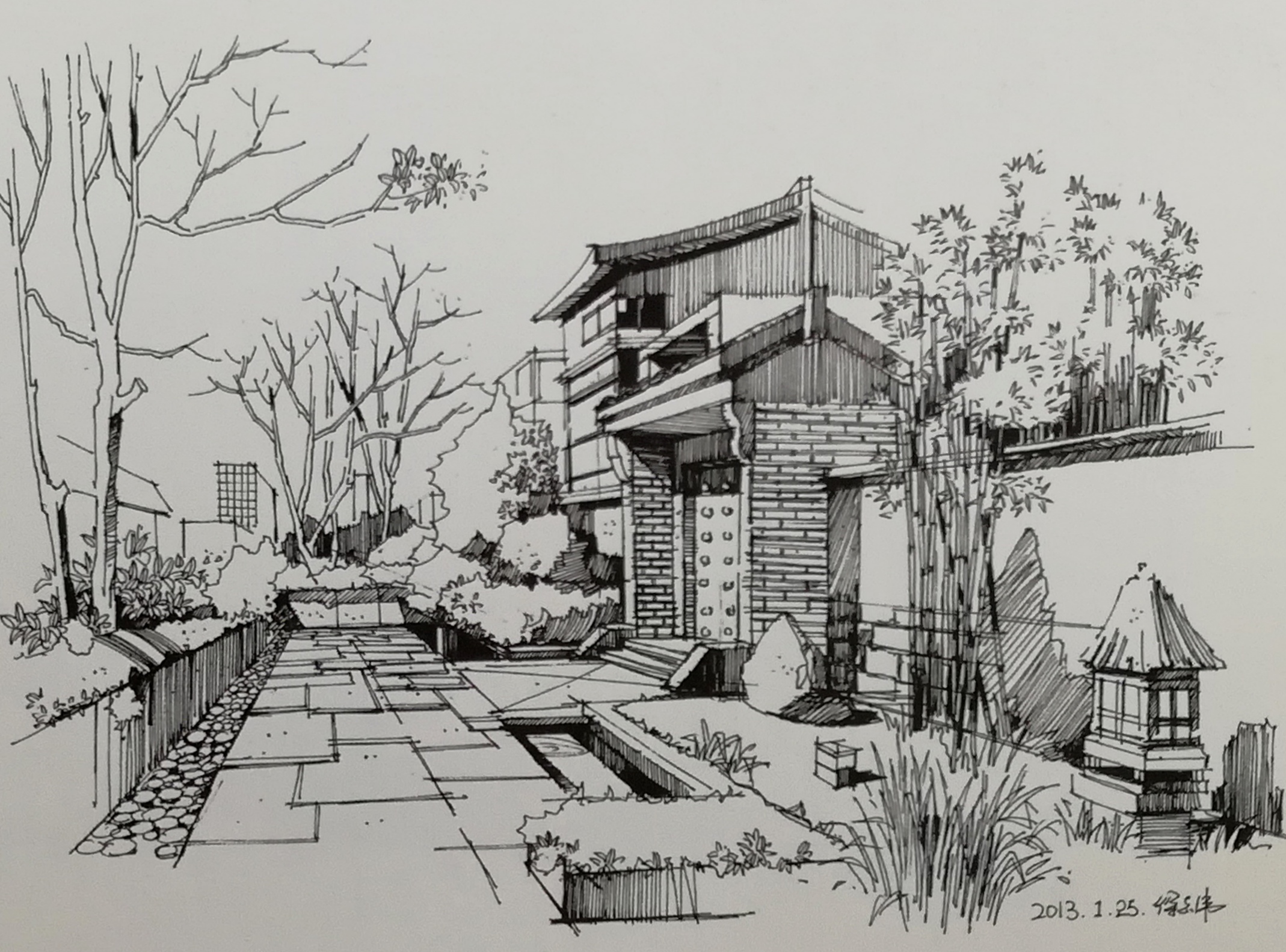 每天保持一张A4纸大小的钢笔草图练习。内容可以是单体训练,建筑配景或室内外陈设训练,或完整的建筑设计场景。每周5张课外草图作业和2张课堂草图作业(35)。作业画在4纸大小的本子上,可以双面画。交作业时,每张作业要写上日期,拍相片并处理好上交到时课程作业库中。