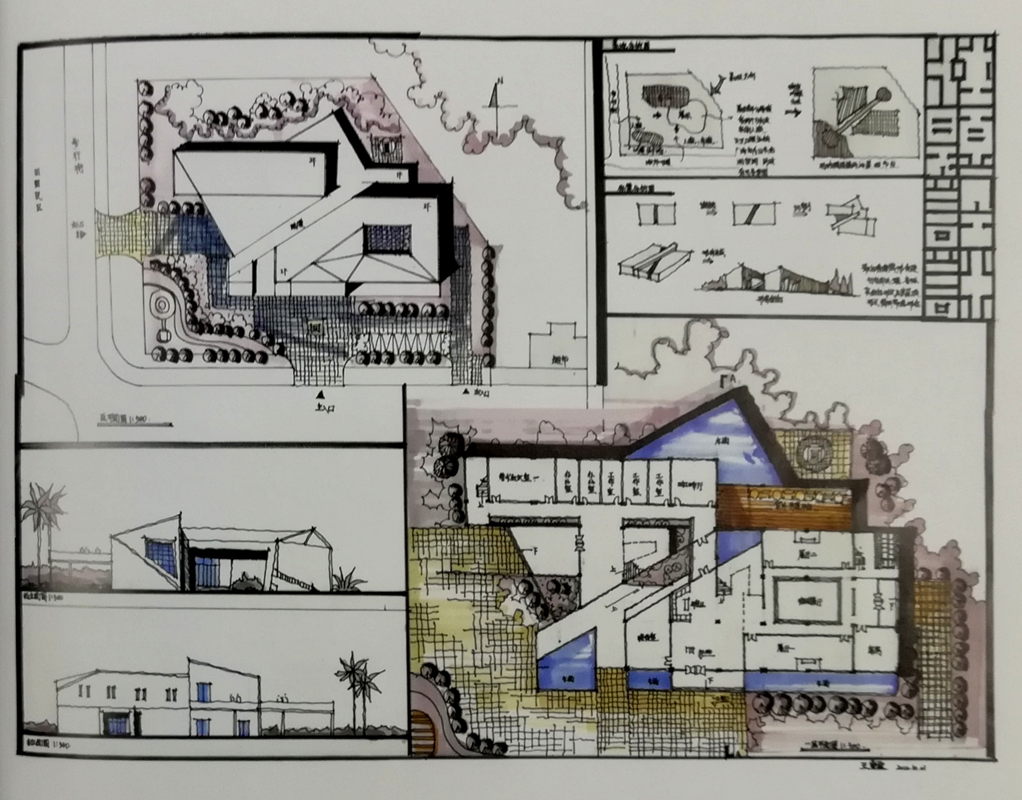 在6周内完成1份(2张)A3大小的定稿手绘快题设计临摩作业。内容包括建筑外观手绘图、总平面图、鸟瞰图、立面图、节点大样图、分析图、设计说明。可以在课本中选图临摩,也可在课外资料中选图临摩。要求运用钢笔、、彩色铅笔、马克笔表现技法完成作业。作业画在A3大小的复印纸上,不用装裱。