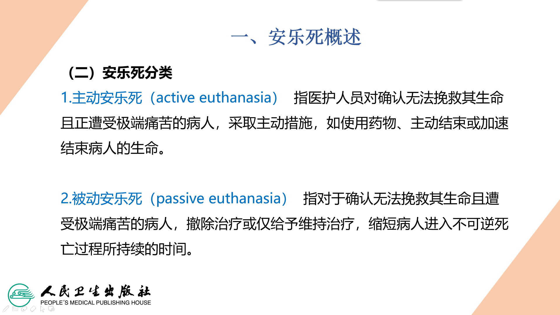 指患不治之症的病人或濒临死亡的人,由于不堪忍受躯体和精神的极度痛苦,在病人及其家属的要求下,由医生按照法定程序,对其停止救治或施以人道的方法使其无痛苦地死亡的过程。