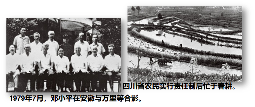 从1978年开始,安徽、四川的基层干部和农民群众,在省委支持下,开始探索试行包产到组、包产到户、包干到户等多种形式的农业生产责任制,取得了很好的效果。其他一些地方也开始实行农村联产责任制。1979年9月,中共十一届四中全会通过了《中共中央关于加快农业发展若干问题的决定》,提出要保障基层干部和农民因时因地制宜的自主权,发挥其主动性。1980年5月,邓小平发表《关于农村政策问题》的谈话,肯定了包产到户这种形式,指出它不会影响我们制度的社会主义性质。后来,中央又进一步肯定包产到户、包干到户是社会主义集体经济的生产责任制,是合作经济的一个经营层次。在中共中央的支持和推动下,以包产到户、包干到户为主要形式的家庭联产承包责任制,在全国各地逐渐推广开来。
