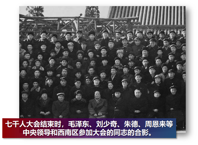 1962年1、2月间,扩大的中共中央工作会议(即“七千人大会”)在北京召开。来自中央、各中央局、各省市自治区党委、地委、县委、重要厂矿党委及军队的负责干部,围绕讨论和修改刘少奇1月27日向大会提交的书面报告,畅所欲言,开展批评和自我批评。毛泽东着重阐述了民主集中制的极端重要性,并带头做了自我批评。这次会议恢复和发扬了党内的民主精神和自我批评精神,统一了全党的认识,对全面贯彻调整国民经济的八字方针起了极其重要的作用。
