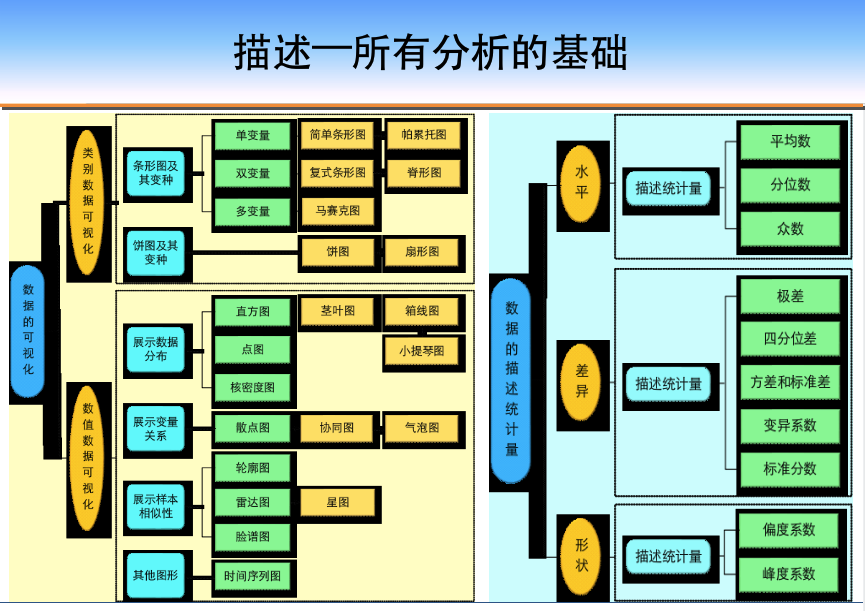 集中趋势的度量;离散程度的度量;偏态与峰态的度量;相对位置的度量