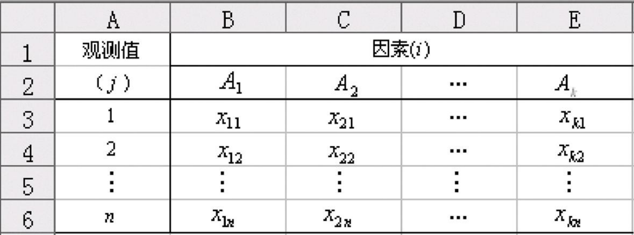 进行单因素方差分析时,需要得到下面的数据结构,如表所示: