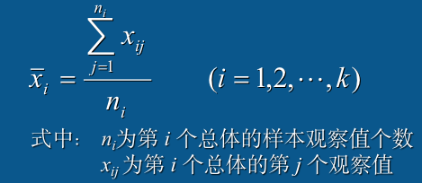 假定从第i个总体中抽取一个容量为ni的简单随机样本,第i个总体的样本均值为该样本的全部观察值总和除以观察值的个数。