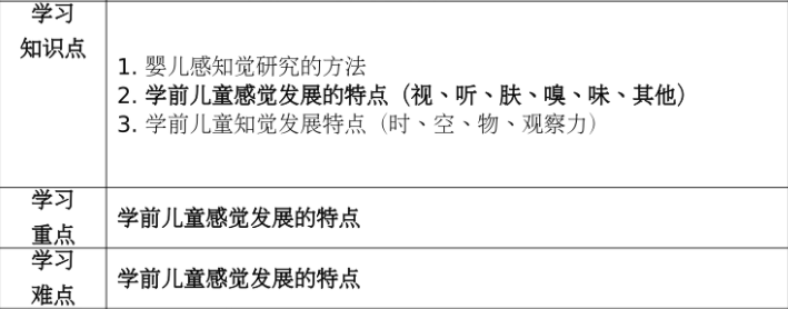 一是学前儿童感知觉的发展——第二个知识点学前儿童感觉发展的特点(视、听、肤、嗅、味、其他)