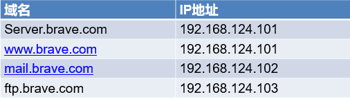某企业申请域名为brave.com,需配置DNS服务实现企业内部域的正向解析。域中服务器主机名与IP的对应关系如下