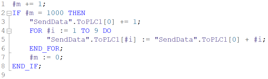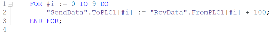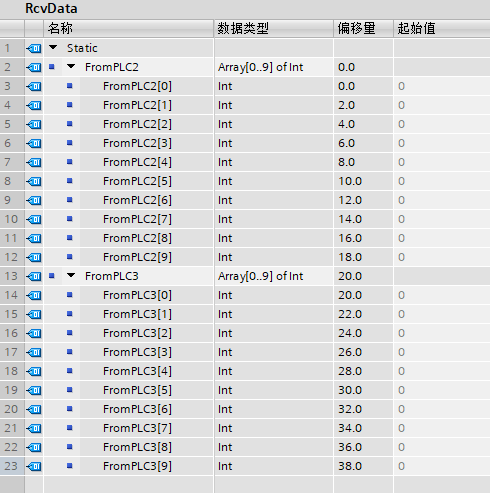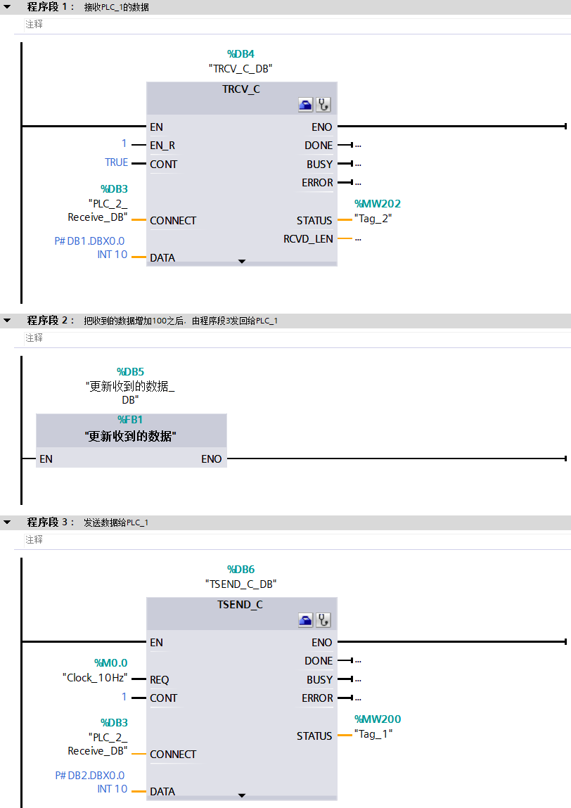 ①在PLC_1和PLC_2之间,能相互发送和接收数据。PLC_1发送到PLC_2的各个数据能自动更新。PLC_2将接收到的PLC_1的各个数据加100之后,再发回给PLC_1。
