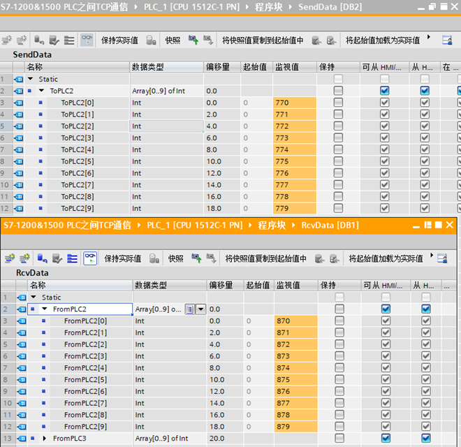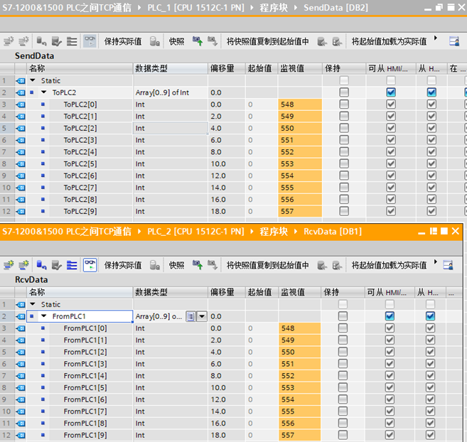 在线监测PLC_1的SendData[DB2]和PLC_2的RcvData[DB1]