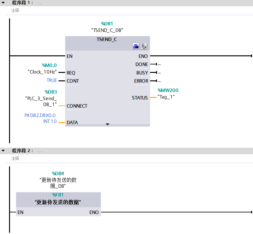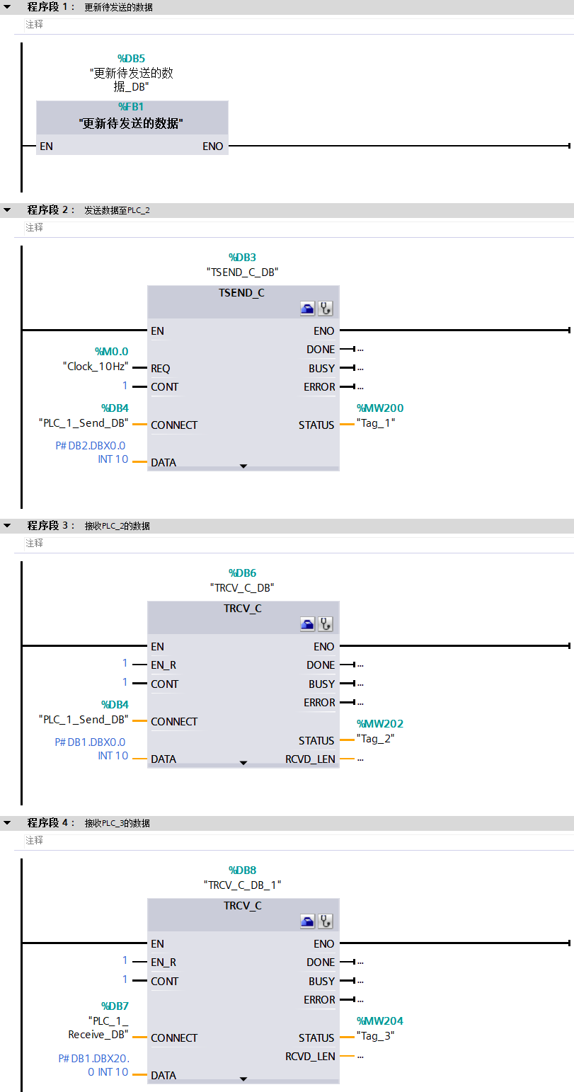 在S7-1200 PLC之间,或者在S7-1500 PLC之间,或者在S7-1200与S7-1500 PLC之间,可以使用TSEND_C/TRCV_C指令进行通信,实现双方数据块的相互发送和接收。