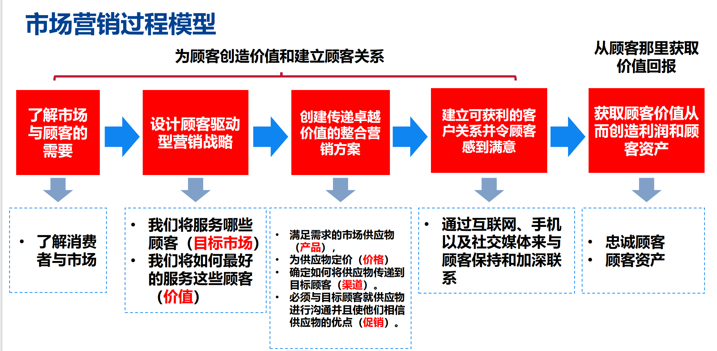市场营销:在不断变化的市场环境中,为顾客创造价值并建立牢固的顾客关系,进而从顾客那里获得回报,完成企业目标的商务活动过程,具体包括市场调研、选择目标市场、产品开发、产品定价、渠道选择、产品促销、产品储存和运输、产品销售、提供服务等一系列与市场相关的企业经营活动。