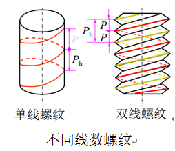 (3)多线螺纹--基于多条螺旋线形成,螺旋线的起点是螺纹的母体底面圆周若干个等分点,Ph=ZP