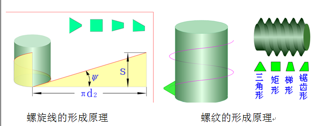在具有螺旋线的圆柱体表面,将一个始终与圆柱体轴线保持在同一平面内的几何截面沿着螺旋线运动,形成不同牙型螺纹。