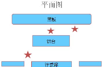 面试过程中的成员包括评委、记分员、监察员和考生。常见位置如下(红色星为考生所处位置):