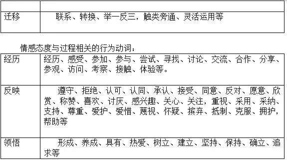 情感态度与价值观目标:(学生)关注、认同、接受、欣赏、称赞、喜欢、感兴趣;尊重、爱护、拥护,帮助;形成、养成、具有、热爱、树立、建立、坚持、保持、确立、追求等。
