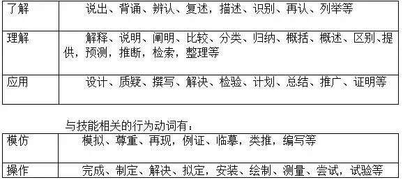 例:知识与技能目标:(学生)“能”——说出、列举、识别,解释、说明、分类、对比、归纳,检验、证明、尝试、模仿,操作、制作