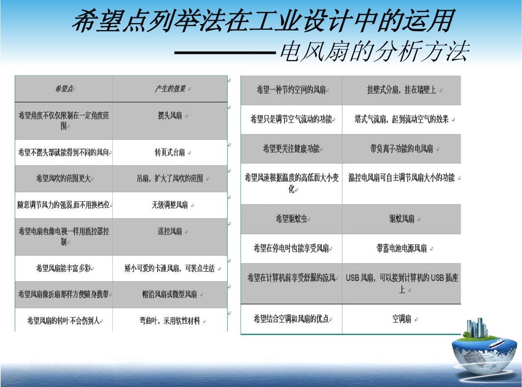 希望点列举发明法不同于缺点列举发明法。后者是围绕现有物品的缺点提出各种改进设想,这种设想不会离开物品的原型,因此,它是一种被动型的创造发明方法。而希望点列举发明法是从发明者的意愿提出各种新的设想,它可以不受原有物品的束缚,因此,它是一种积极、主动型的创造发明方法。