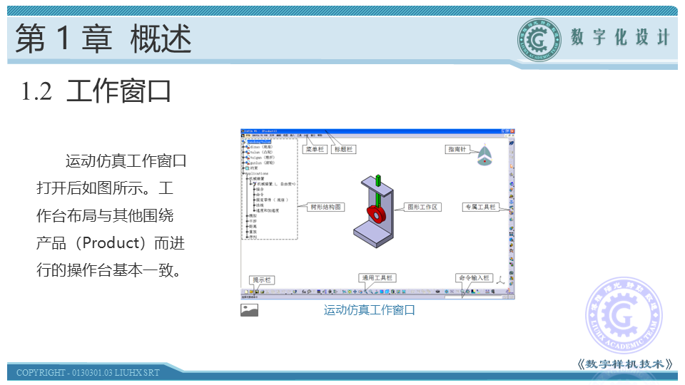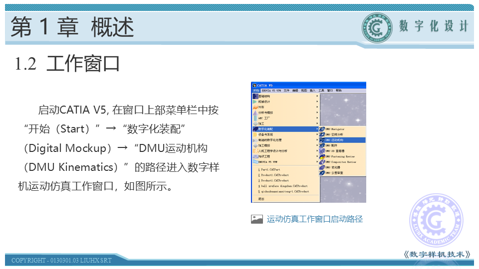 本节主要介绍CATIA V5运动仿真工作窗口。启动CATIA V5, 在窗口上部菜单栏中按“开始(Start)”→“数字化装配(Digital Mockup)”→“DMU运动机构(DMU Kinematics)”的路径进入数字样机运动仿真工作窗口。工作台布局与其他围绕产品(Product)而进行的操作台基本一致。与其他工作台的区别在于屏幕右侧放置了对应运动仿真窗口的专属工具栏(Workbench specific toolbars)。